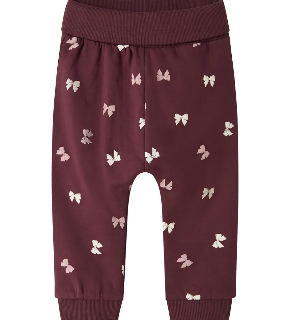 Smarte Name It sweatpants i mørkerød med print af sløjfer i rosa nuancer. Sweatpantsene har en elastisk ribkant i livet og ved anklerne, der giver en behagelig pasform.