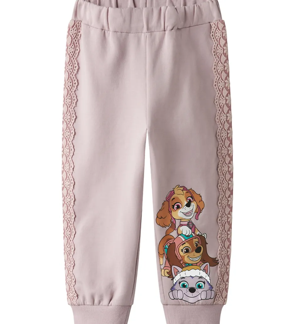 Flotte Name It sweatpants i en lyserosa farve med et charmerende Paw Patrol-print nederst på det ene ben. De har fine blonde detaljer langs begge sider, hvilket giver et elegant udtryk.