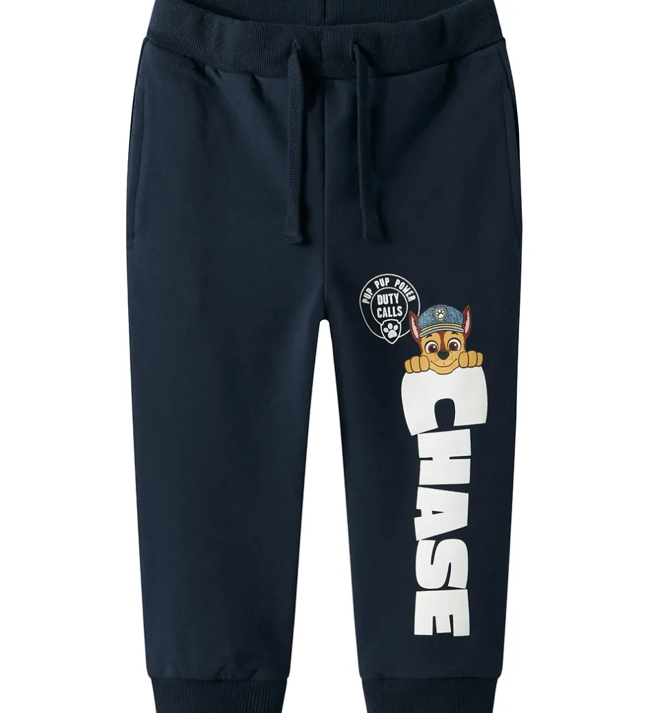 Flotte Name It sweatpants i en klassisk, mørkeblå nuance med et sjovt Paw Patrol-print af Chase på benet. Name It sweatpants er designet med en justerbar elastikkant i livet og ribkant ved anklerne, hvilket giver en behagelig pasform.