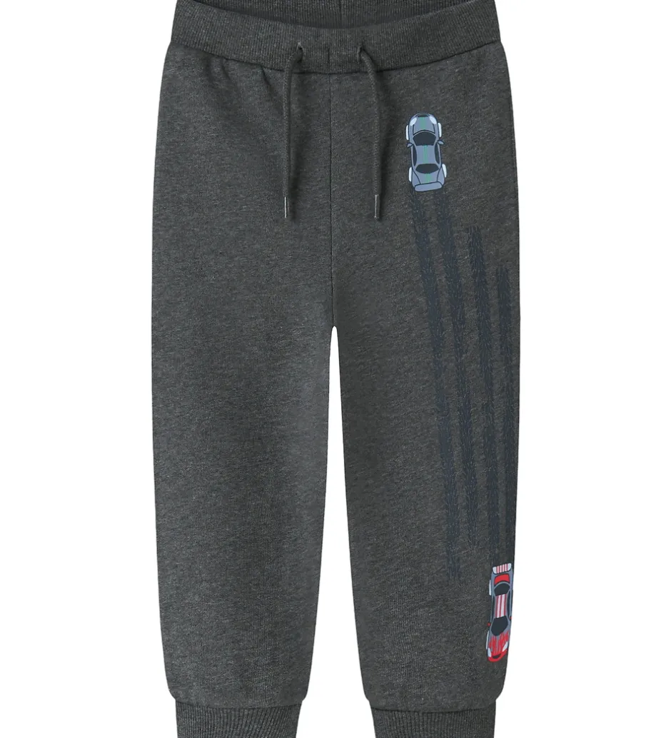 Seje Name It sweatpants i meleret mørkegrå med print af hjulspor og to racerbiler på det ene ben. Sweatpantsene har en god elastik i livet, som kan justeres med knapper indvendigt. Fortil er der dekorative snører og lommer i siderne. I benåbningerne er der ribkanter, og indvendigt er der blødt, børstet bomuld.