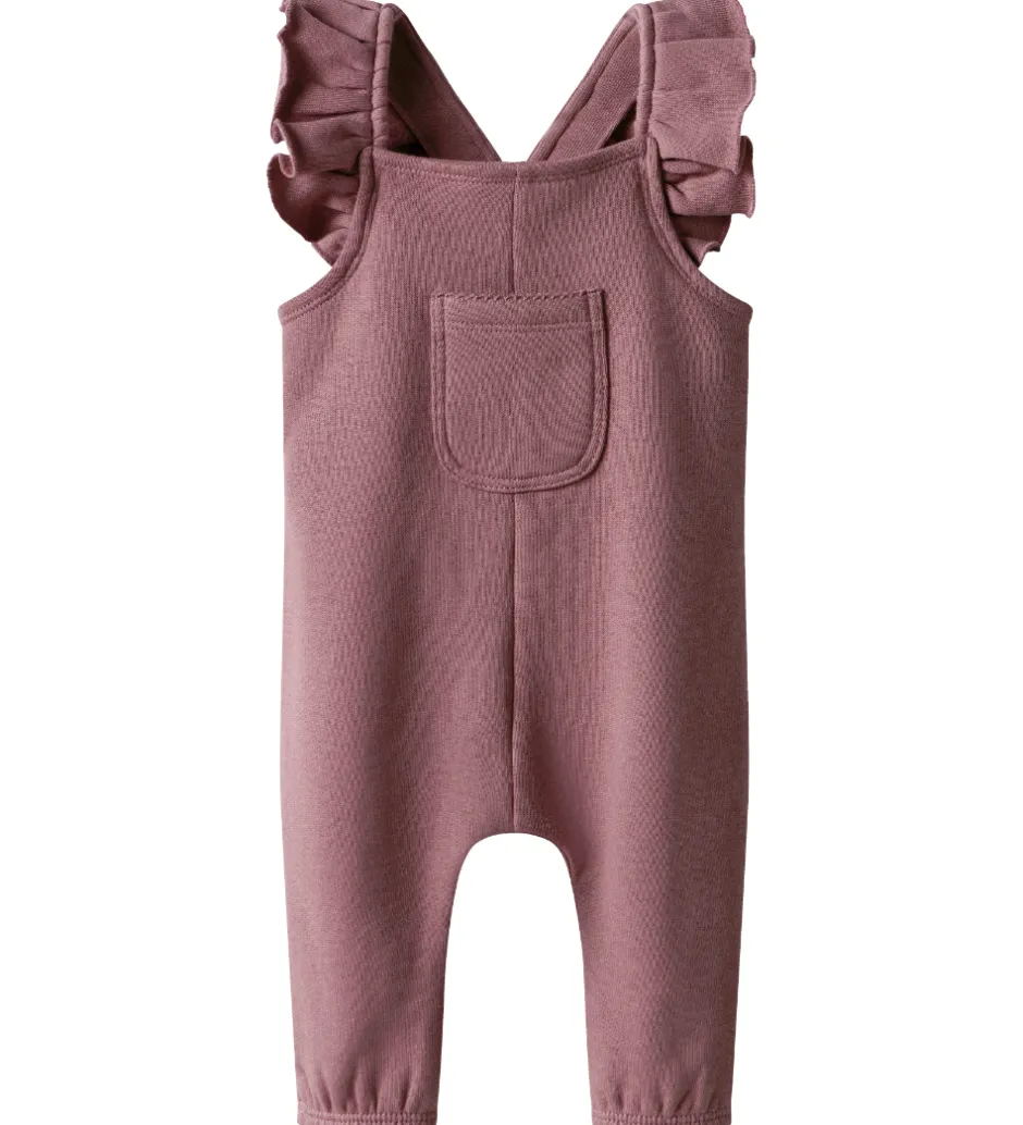 Fine Lil Atelier smækbukser i en varm rosa nuance. Lil Atelier smækbukserne har flæsedetaljer ved stropperne og en praktisk lomme på brystet. Skulderstropperne sættes fast bagpå med knapper, og i siderne er der knapper, som gør det nemt at få dem af og på. Smækbukserne har lange ben med elastik ved anklerne.