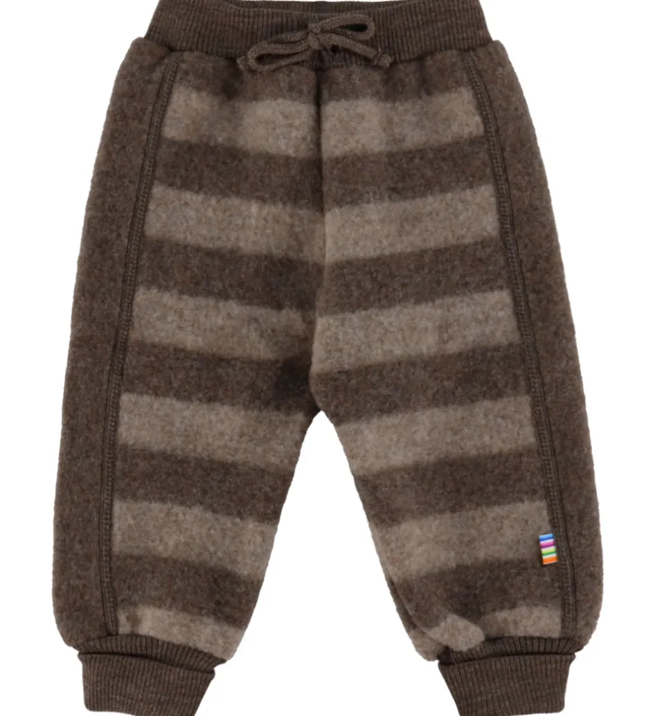 Komfortable Joha bukser med stribet design i brune nuancer. Joha bukserne har elastik i taljen og dekorative snører foran. De har en behagelig pasform med brede ribknater ved anklerne. Bukserne er fremstillet i en kraftig kvalitet i blødt merinould.