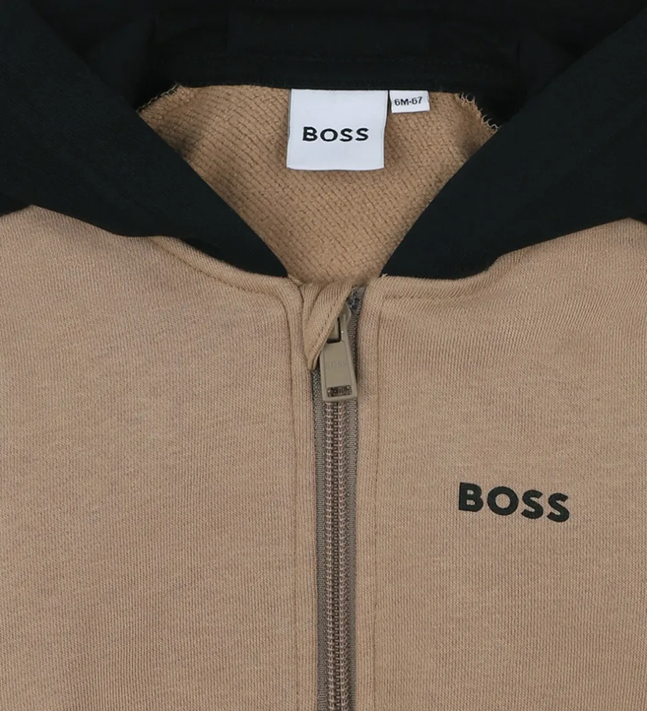 Smart BOSS cardigan i brunt sweat med detaljer i sort og hvid. Cardiganen har en hætte med bomuldsfor, og den har ribkanter for et klassisk look. Cardiganen lukkes med en lynlås, og i siderne er der praktiske lommer. Cardiganen har blødt, børstet bomuld på indersiden.