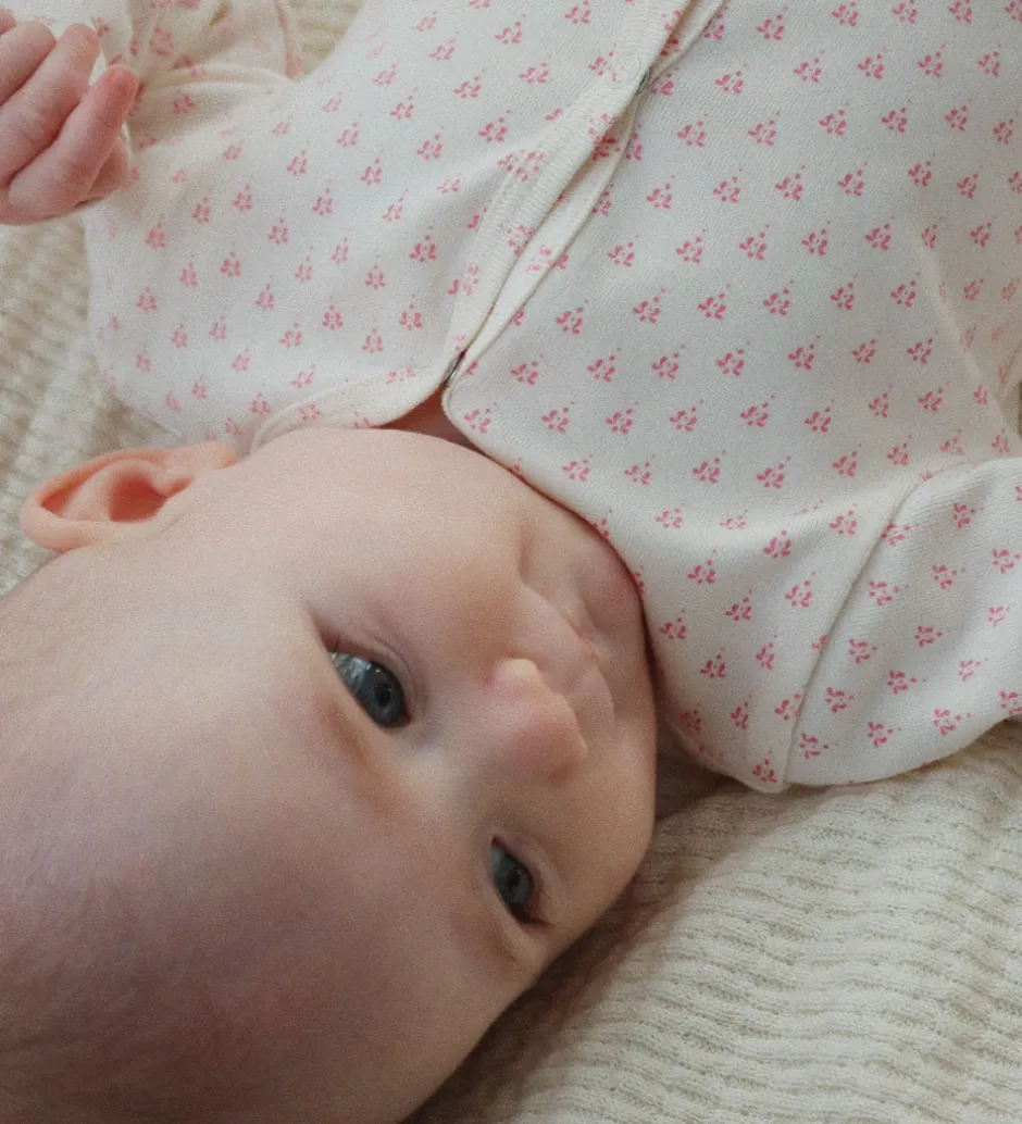 Dejligt Fanga Fontana sæt med en cardigan, et par leggings og en hue. Sætter er i cremehvid med et diskret print af små, rosa motiver.