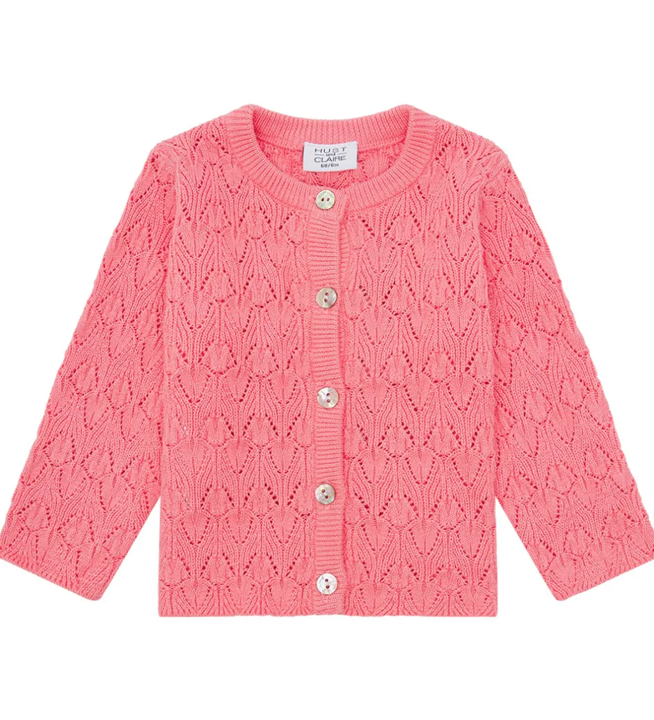 Smuk Hust and Claire cardigan i en lys rosa nuance med lange ærmer og en indbydende, hulmønstret struktur. Hust and Claire cardiganen har elegante ribkanter langs knaplukningen og ved håndleddene. De fine knapper i front tilføjer et enkelt og stilfuldt element til cardiganens design. Det åbne hulmønster giver et let og luftigt udtryk.