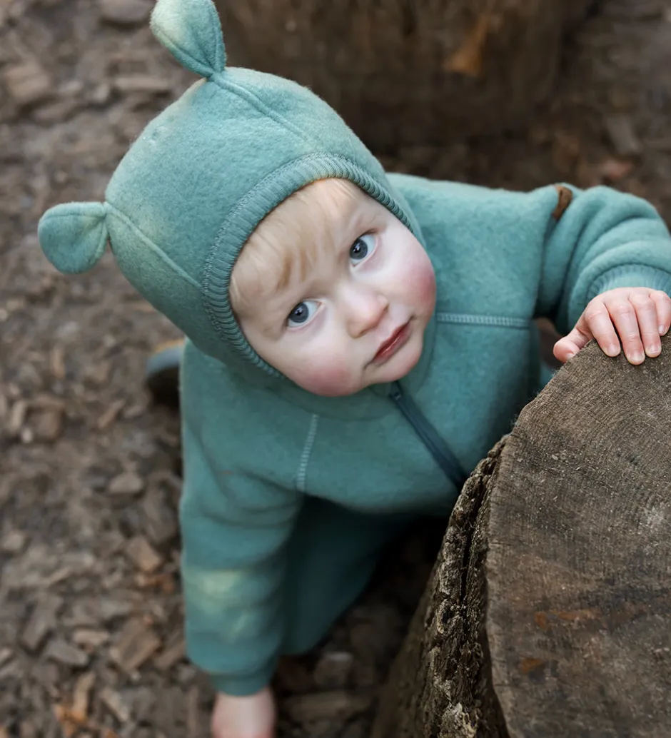 Lækker Mikk-Line cardigan af filtet merinould i mørk, støvet grøn.