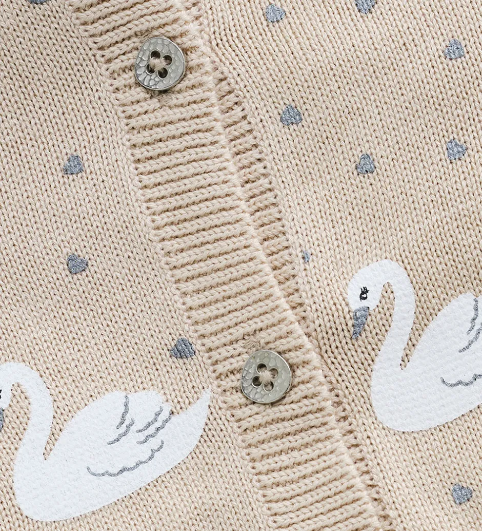Charmerende Minymo cardigan i en lys beige nuance med print af hvide svaner og små hjerter i sølv glimmer. Minymo cardiganen har en strikket struktur med gennemgående knaplukning fortil. Den har lange ærmer og en klassisk rund halsudskæring.