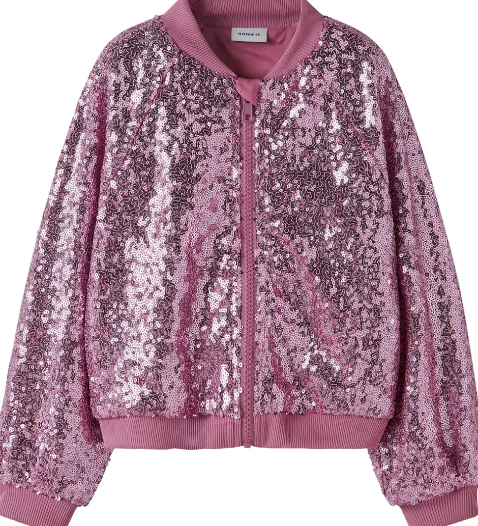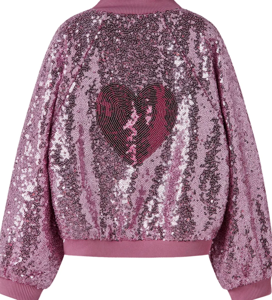 Festlig Name It bomberjakke i lilla med palietter. På ryggen er der palietter som danner et hjerte i midten i mørk rosa. Name It bomberjakken har en gennemgående lynlås fortil og lange ærmer. Ved hals-, ærme og taljeåbning er der ribkanter, som giver en god pasform.