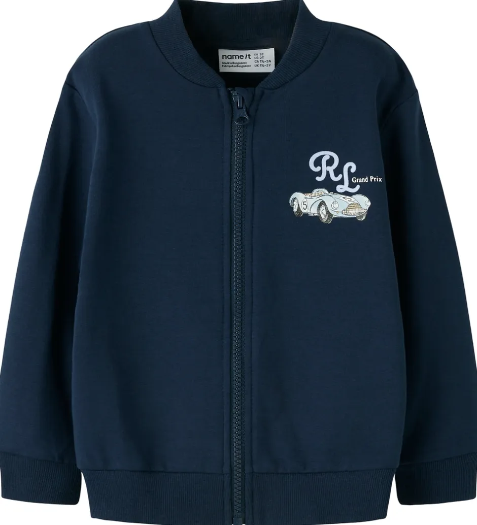 Flot Name It cardigan i navyblå med print af en racerbil og teksten “RL Grand Prix” på venstre bryst. Name It cardiganen er udstyret med en praktisk lynlås foran og har ribkanter ved hals, ærmer og bund, hvilket giver en god pasform. Indvendigt er der blødt, børstet bomukld.