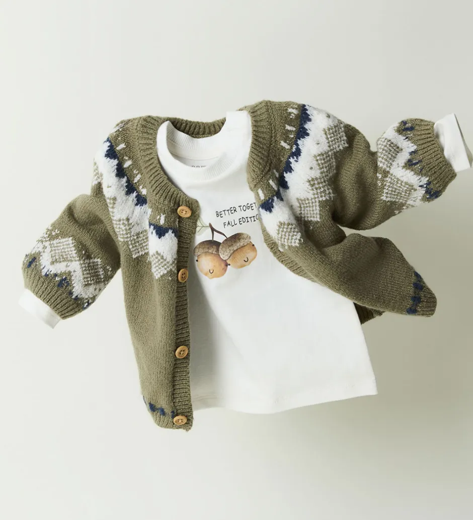 Charmerende Name It cardigan i støvet grøn med mønster i hvid og mørkeblå i toppen, bunden og nederst på ærmerne. Cardiganen har en strikket struktur med en rund halsudskæring og lange ærmer med smalle ribkanter. Den har en praktisk knaplukning foran.