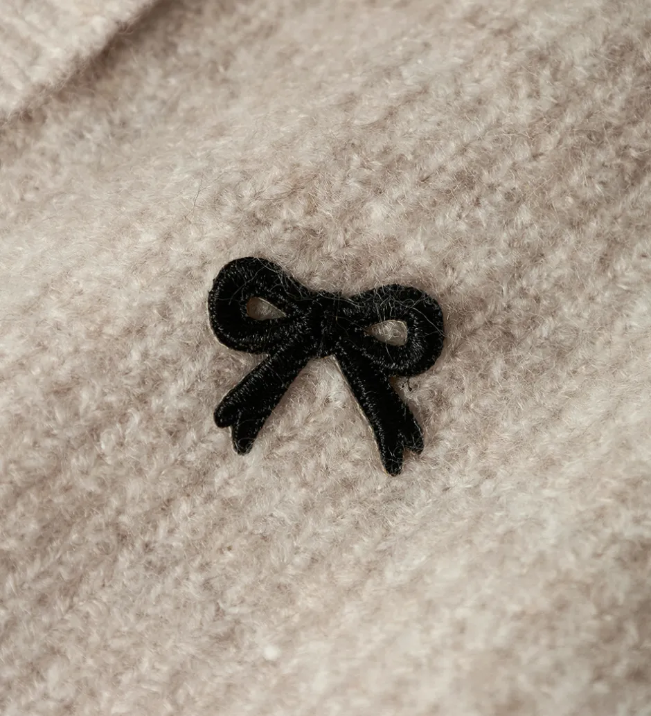 Charmerende Name It cardigan i beige strik med små applikationer af sorte sløjfer. Cardiganen har gennemgående knapper fortil og lange ærmer.