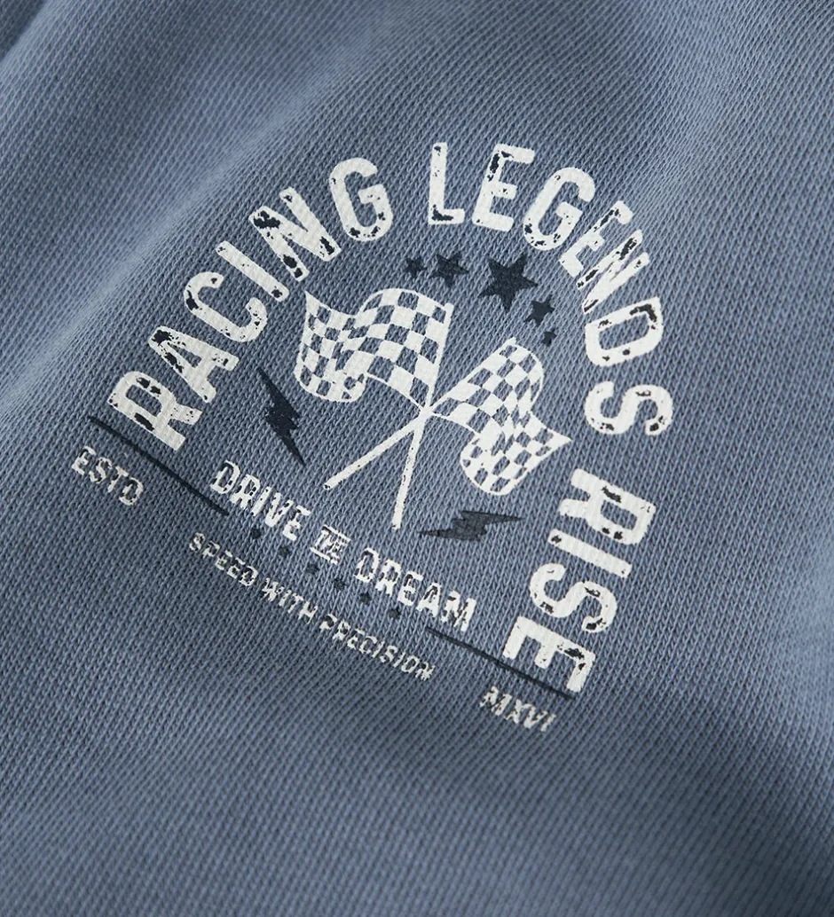 Smart Name It cardigan i støvet blå sweat med et print af to målflag og teksten “Racing Legends Rice” i hvid på venstre bryst. Name It cardiganen har en praktisk hætte og en lynlåslukning foran. Den har lange ærmer med ribkanter, og indvendigt er der blødt, børstet bomuld.