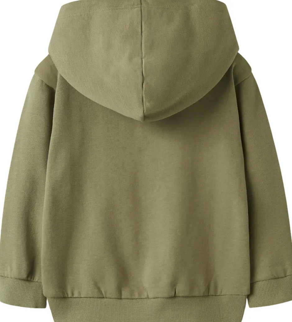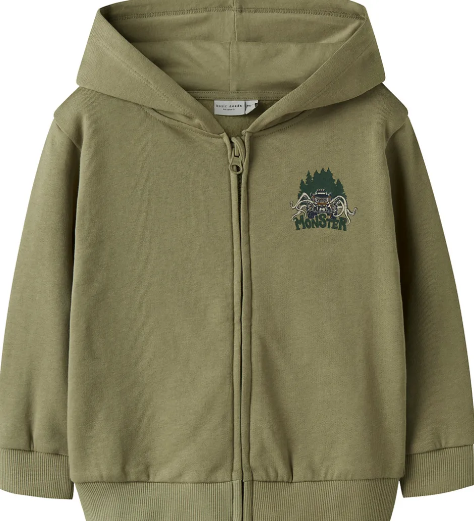 Stilfuld Name It cardigan i olivengrøn med et lille print på venstre bryst af en monstertruck og teksten “Monster”. Cardiganen er i en lækker sweatkvalitet med en fastsyet hætte, lange ærmer og gennemgående lynlås fortil. Den har ribkanter i alle åbninger, og indvendigt er der blødt, børstet bomuld.