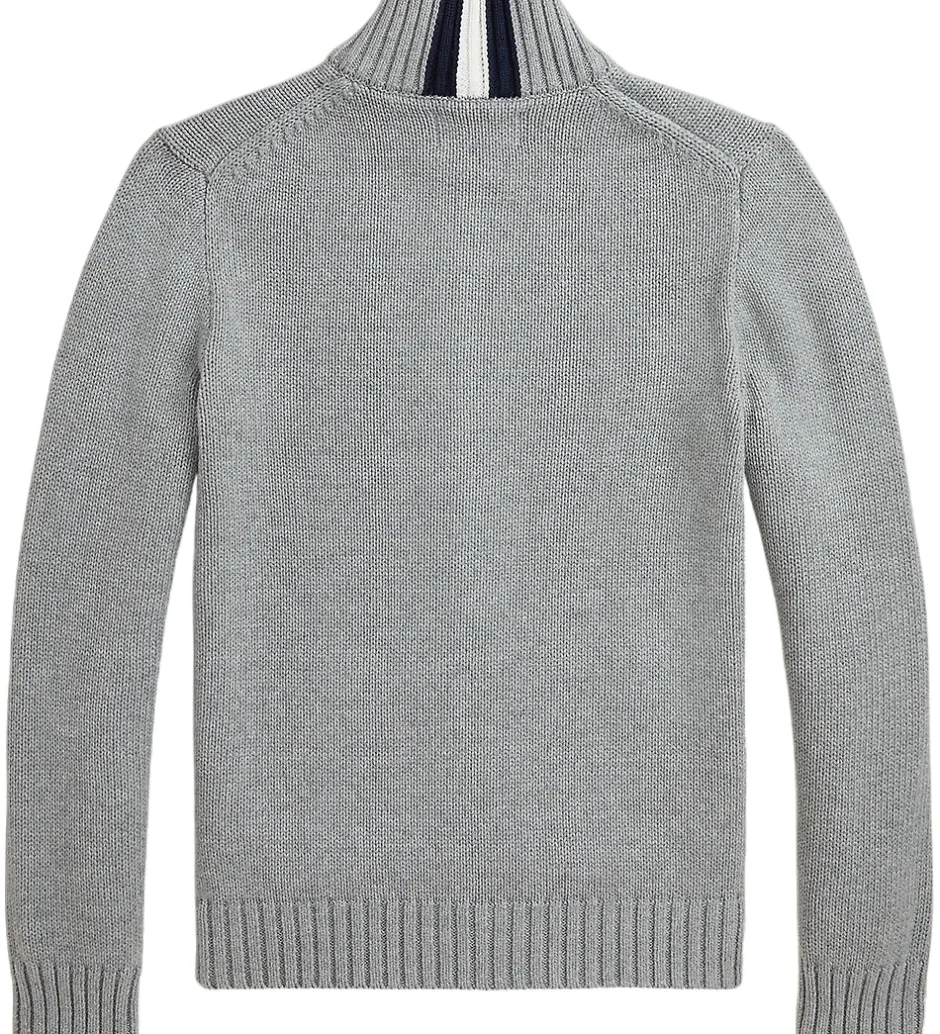 Stilfuld cardigan fra Polo Ralph Lauren i gråmeleret bomuldsstrik, og i nakken er der hvide og navy striber. Cardiganen har en høj hals, og den har brede ribkanter. Den åbnes med en skjult lynlås, og fortil sidder der to lommer.