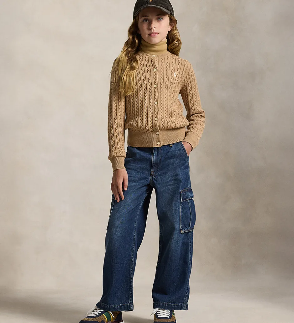 Stilfuld cardigan fra Polo Ralph Lauren i ensfarver brun i en strikket kvalitet med et flot, snoet mønster. Cardiganen har lange ærmer. Den er designet med en rund halsudskæring og en gennemgående knaplukning med elegante knapper. Polo Ralph Lauren logoet er diskret placeret på brystet, hvilket giver en tidløs markering.