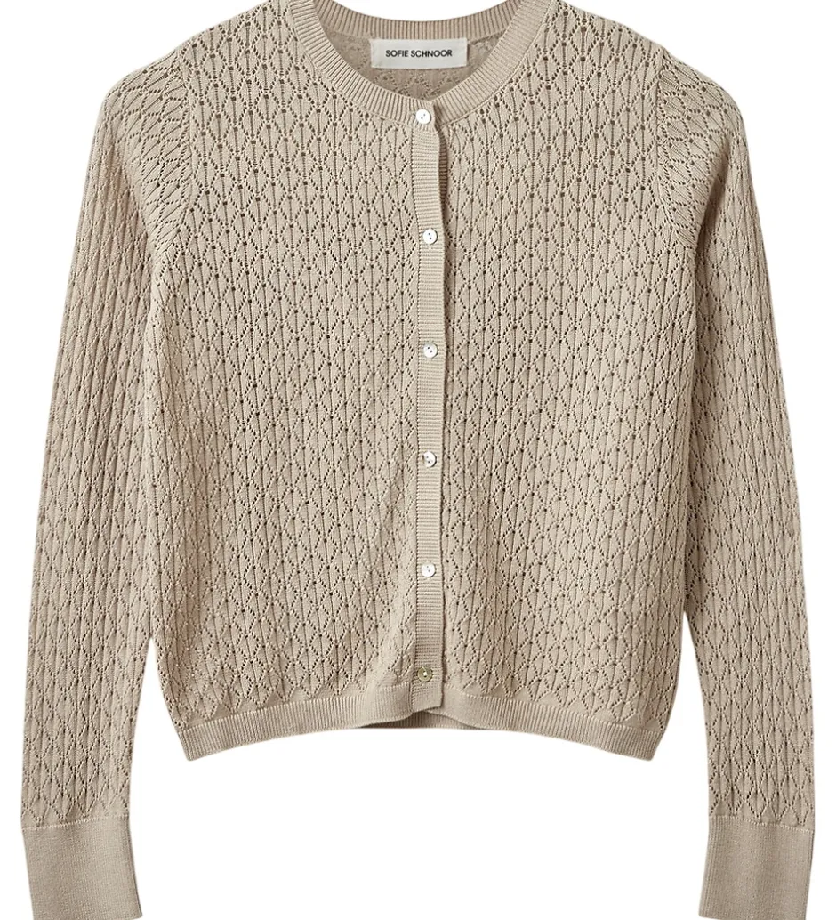 Elegant Sofie Schnoor cardigan i en neutral beige farve med en fin hulmønsterstruktur. Denne Sofie Schnoor model har knaplukning foran og lange ærmer, der afsluttes med ribkanter. Den runde halsudskæring og pasformen gør cardiganen anvendelig til forskellige anledninger. Detaljerne giver et stilrent udtryk.