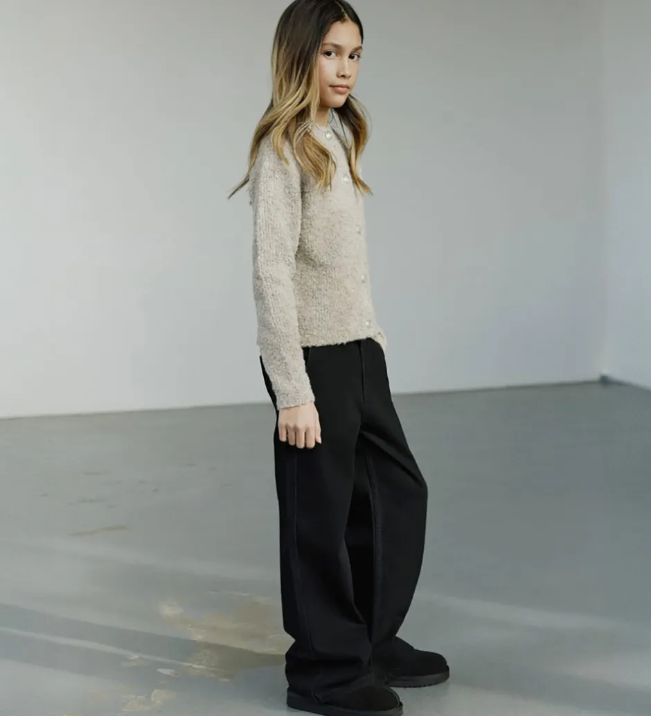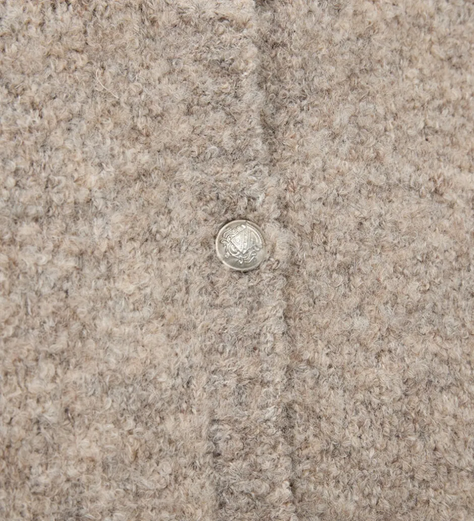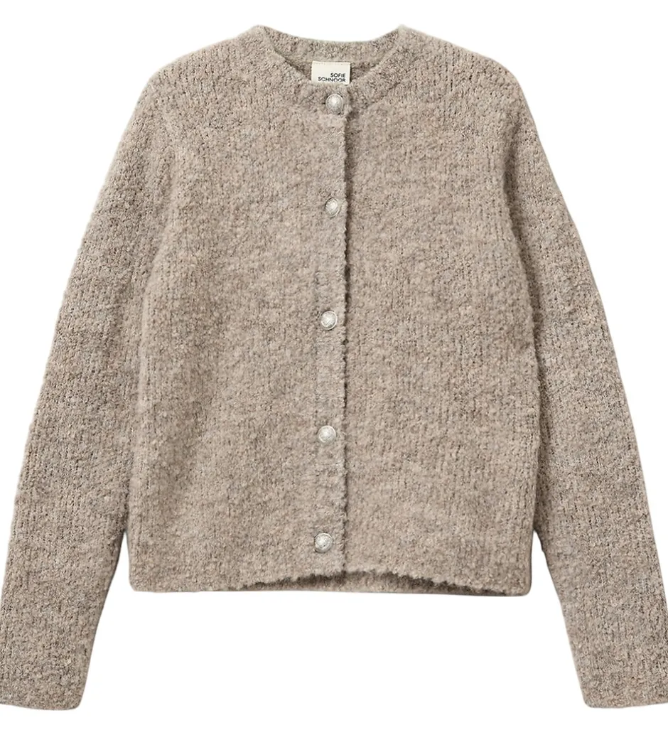 Stilren Sofie Schnoor cardigan i en lys beige, meleret nuance med lange ærmer. Sofie Schnoor cardiganen er strikket med en blød tekstur og har en enkel knaplukning foran. Den har en rund halsudskæring, der giver et klassisk look. Cardiganens design fremhæver en afslappet pasform, der er tydelig i det strikkede materiale.