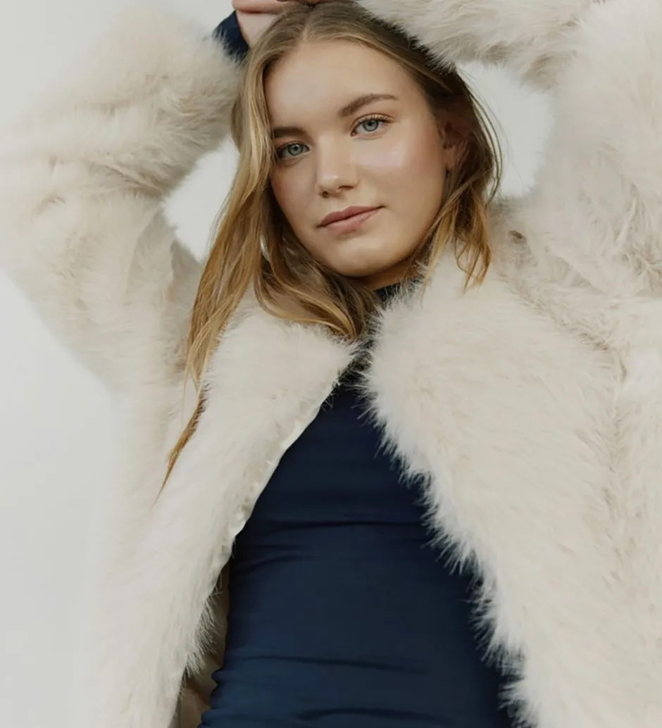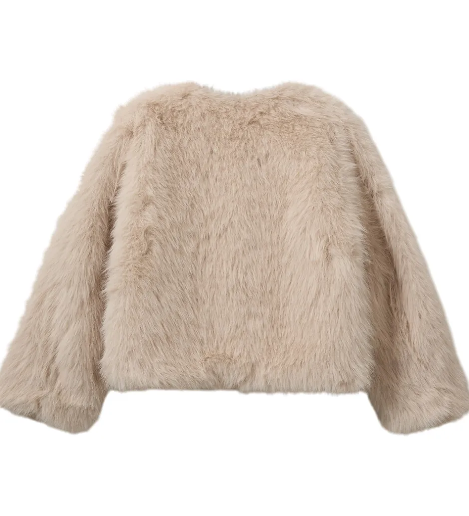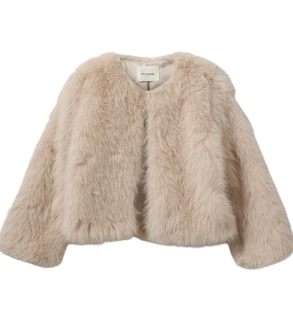 Stilfuld Sofie Schnoor jakke i en blød gråbeige nuance af imiteret pels. Jakken har lange ærmer og en åben front, der giver et klassisk udtryk. Sofie Schnoor jakkens elegante snit fremhæver dens tidløse design og luksuriøse look.