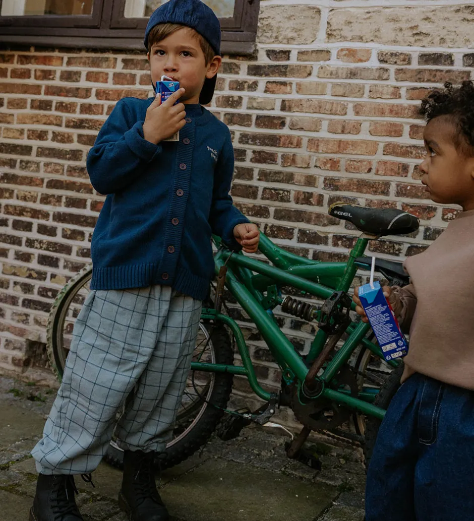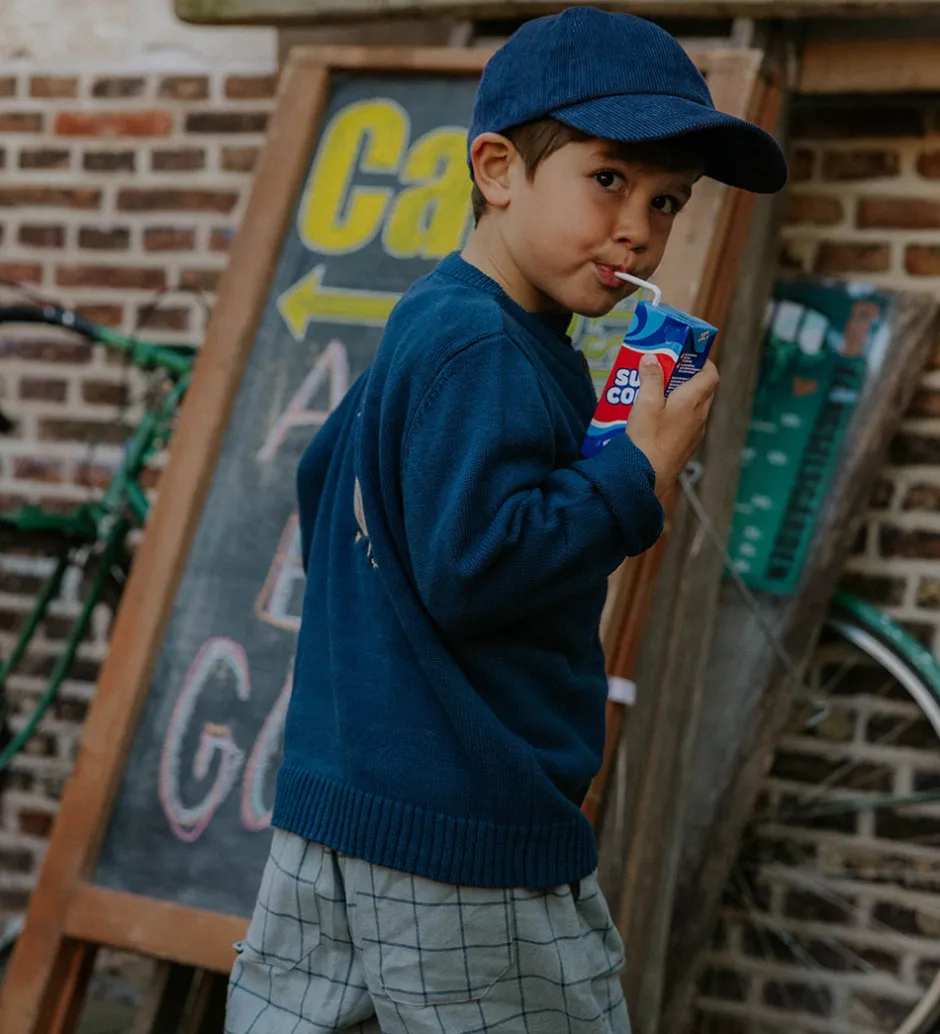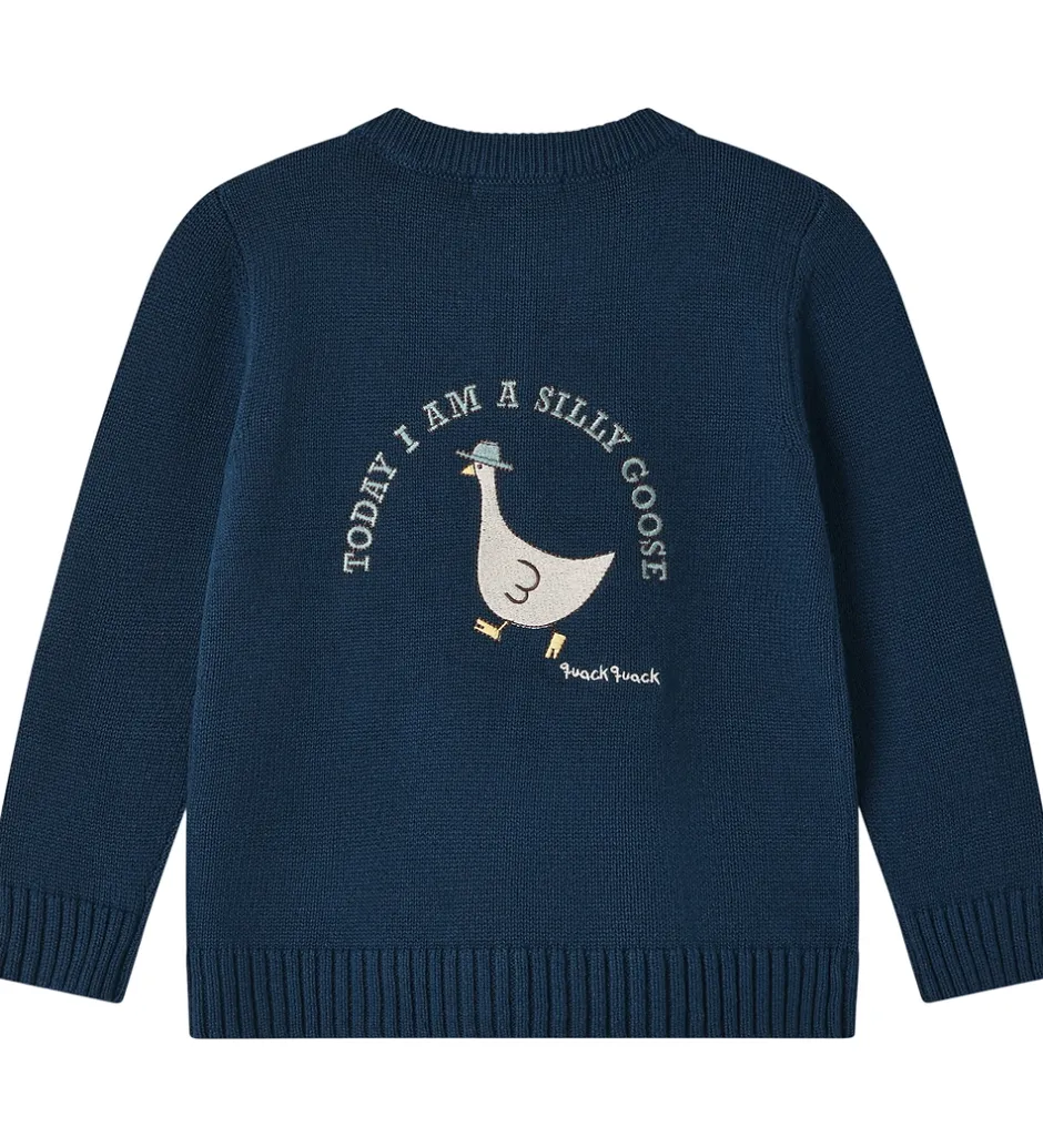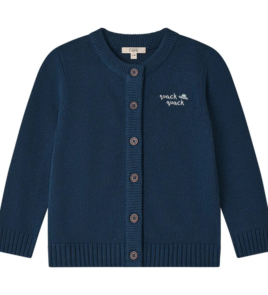 Stilfuld Fliink cardigan i en dyb, blå farve med lange ærmer. Fliink cardiganen er udsmykket med en tekst broderet på brystet, der siger “quack quack”, samt med en broderet and på ryggen.