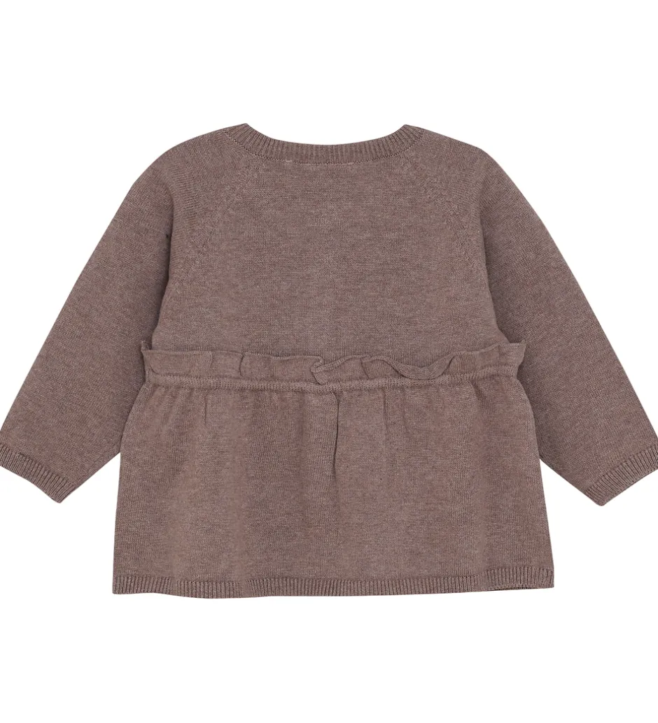 Charmerende Minymo cardigan i en varm brun nuance med lange ærmer. Cardiganen har en klassisk rund halsudskæring og knaplukning foran. Der er en fin flæse med rynkedetaljer over taljen, som tilføjer et elegant præg. Den har ribkanter i alle åbninger, som giver en god pasform. Minymo cardiganen er fremstillet af 80% bomuld og 20% uld.