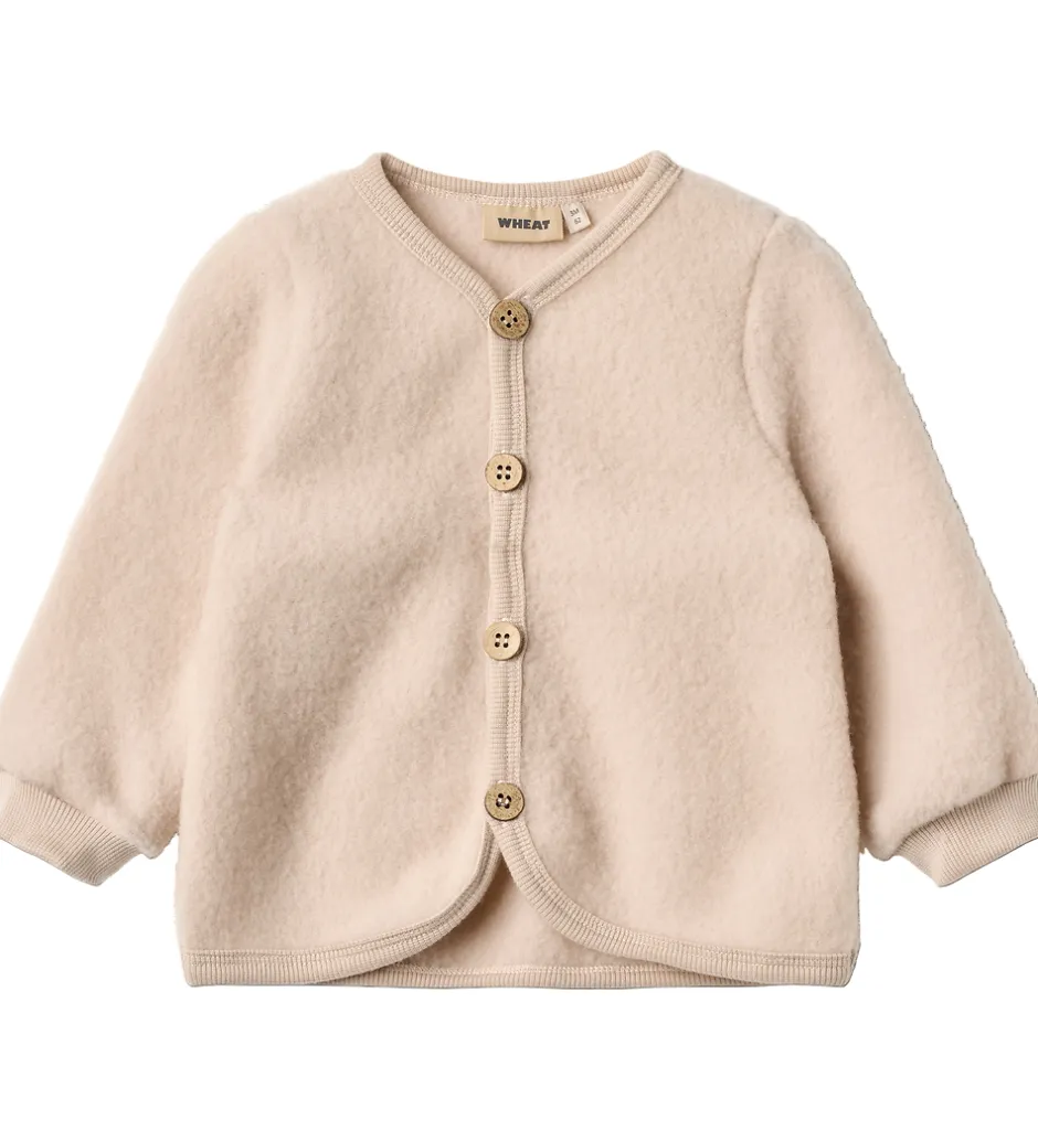Flot Wheat cardigan i en rosabeige nuance med lange ærmer. Cardiganen fra Wheat er udstyret med fine træknapper langs fronten, der giver et naturligt touch. Ribkanter ved hals, ærmer og bund afrunder designet på en diskret måde.