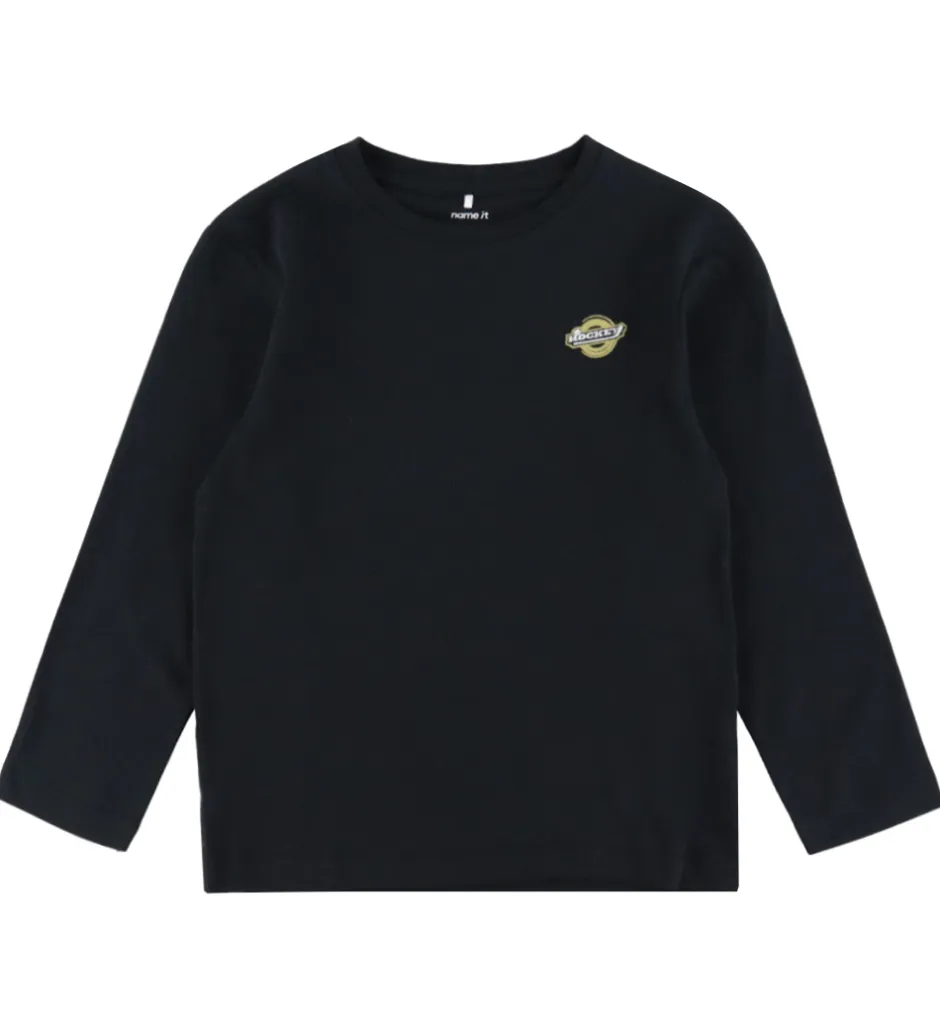 Elegant Name It bluse i sort med lange ærmer. Blusen har et lille, rundt logo på brystet i diskrete nuancer, som tilføjer en subtil detalje. Designet inkluderer en klassisk rund halsudskæring. Name It skaber produkter med fokus på enkelhed og funktionalitet.