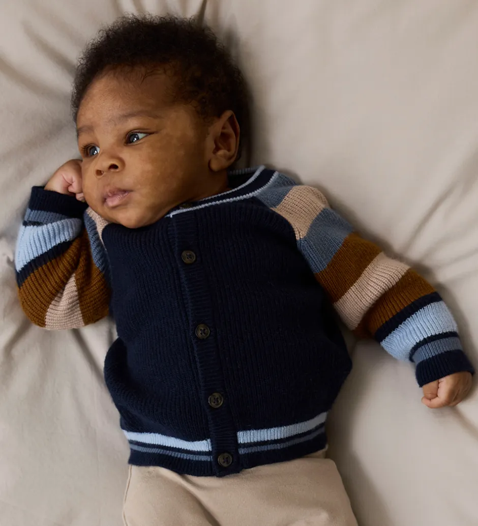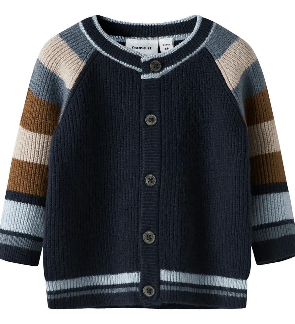 Klassisk Name It cardigan i navyblå med stribede ærmer i brune og blå nuancer. Cardiganen har en strikket struktur med en rund halsudskæring og gennemgående knapper foran.
