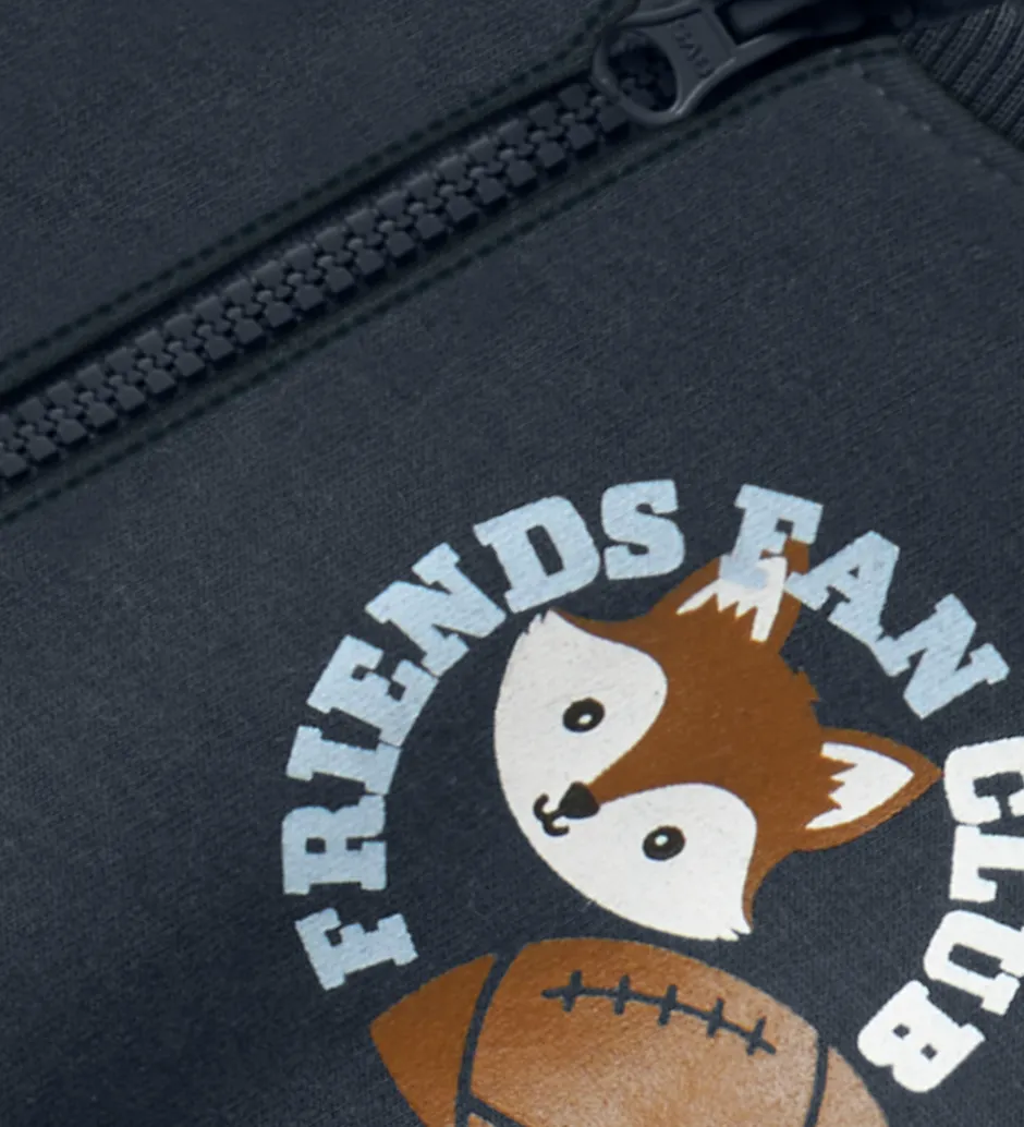 Flot heldragt fra Name It i en enkel, mørkeblå farve med kontrasterende beige ærmer. Et sødt motiv pryder brystet med teksten “Friends Fan Club”.