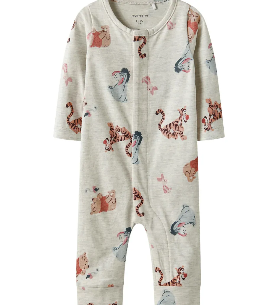 Charmerende natdragt fra Name It i gråmeleret med et alloverprint af Disney-karakterer fra Peter Plys. Natdragten har trykknapper fra hagen til venstre ankel. Den har lange arme og lange ben med brede kanter i benåbningerne.