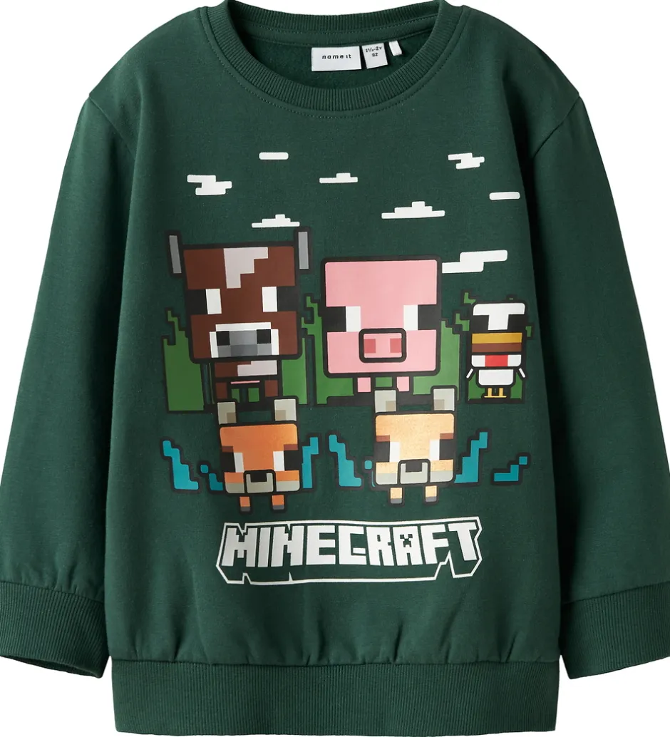 Smart Name It sweatshirt i en dyb grøn farve med et Minecraft-tema. Printet viser flere ikoniske figurer fra spillet, hvilket skaber et sjovt og iøjnefaldende design. Name It sweatshirten har en rund halsudskæring og lange ærmer, hvilket gør den ideel til enhver garderobe. Indvendigt er der blødt, børstet bomuld.
