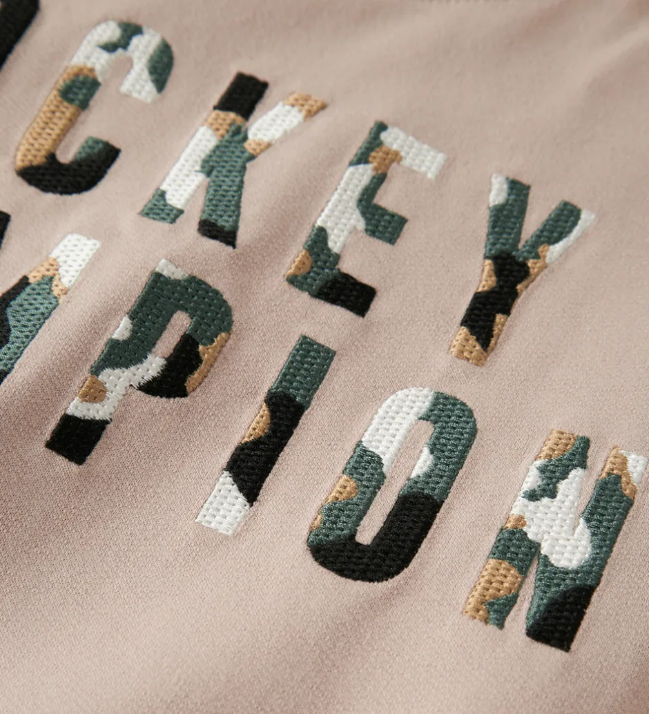 Smart Name It sweatshirt i en lysebrun nuance med teksten “Hockey Champion” på forsiden i camouflageprint. Sweatshirten har lange ærmer og en rund halsudskæring. Den har ribkanter ved alle åbninger, og indvendigt er der blødt, børstet bomuld.