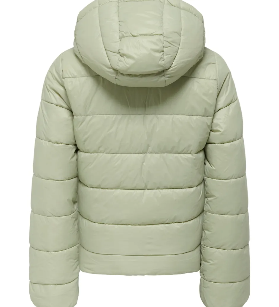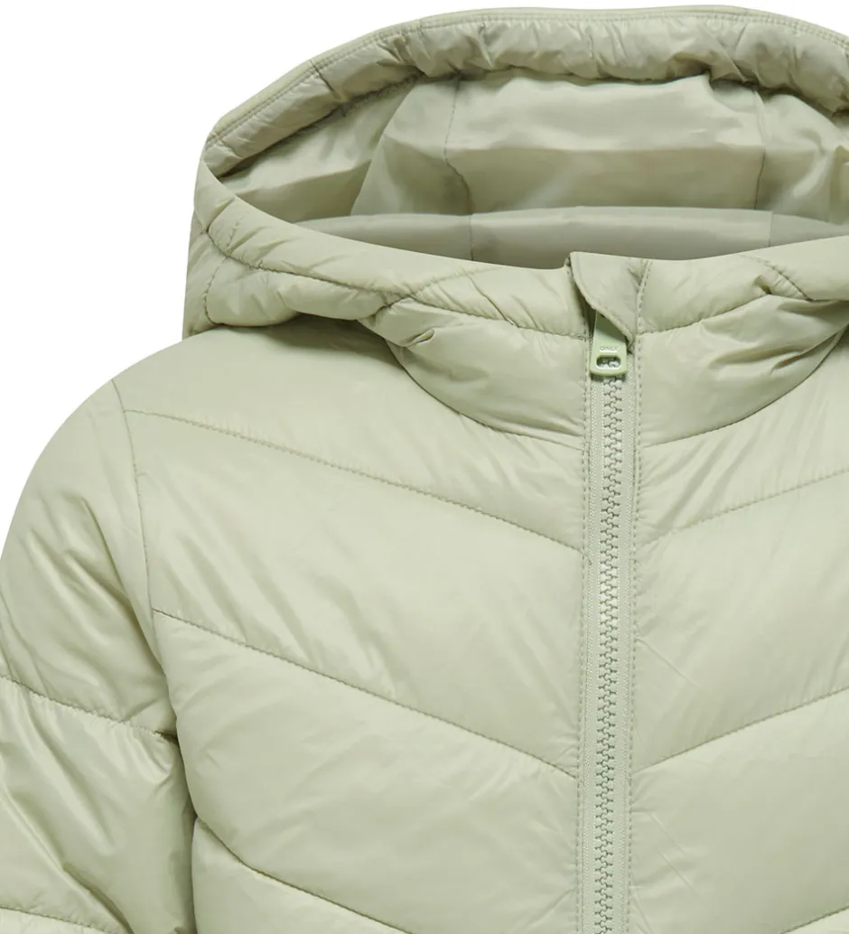 Dejlig Kids Only dynejakke i støvet grøn med en smule skinnende overflade. Dynejakken er i en glatvævet kvalitet og med skrå syninger.