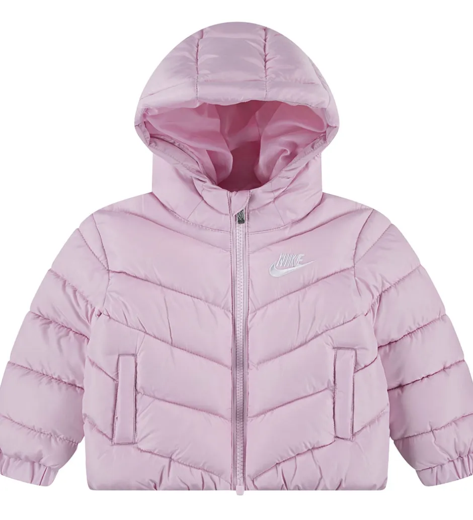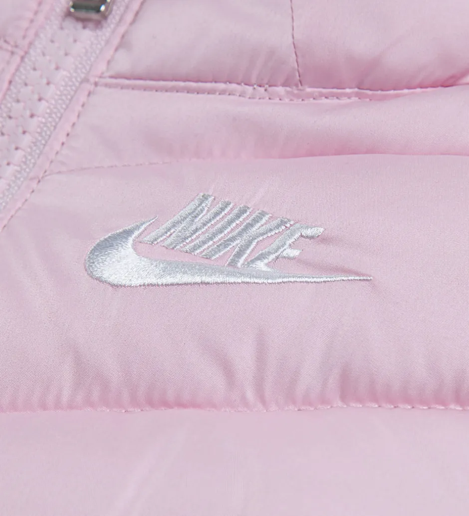 Lækker Nike dynejakke i rosa med et broderet, hvidt logo på venstre bryst og skrå syninger.