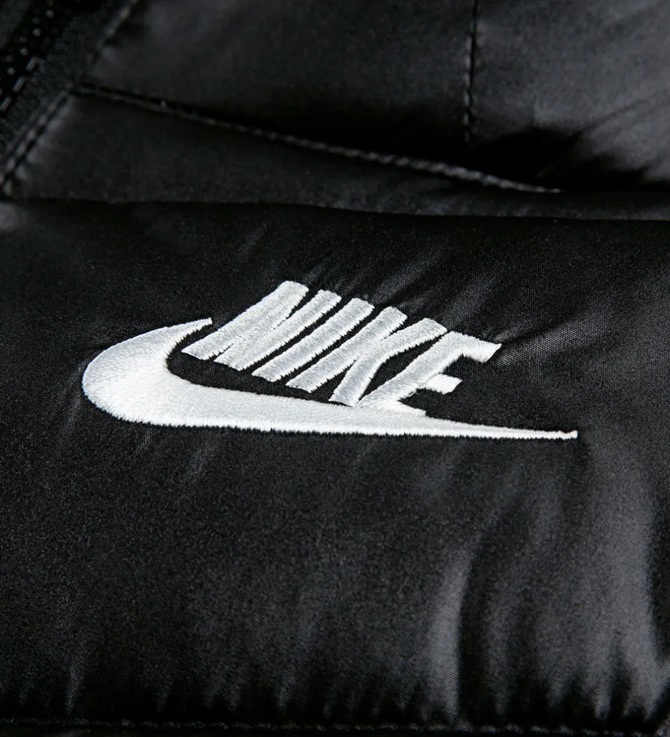 Lækker Nike dynejakke i sort med et broderet, hvidt logo på venstre bryst og skrå syninger.