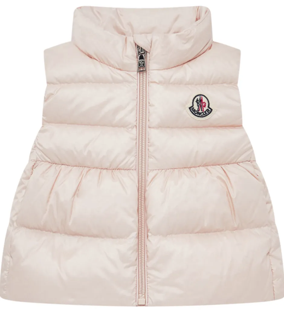 Fin Moncler dunvest i ensfarvet pudderrosa, og fortil i venstre side sidder der et filt-mærke med et Moncler-logo.