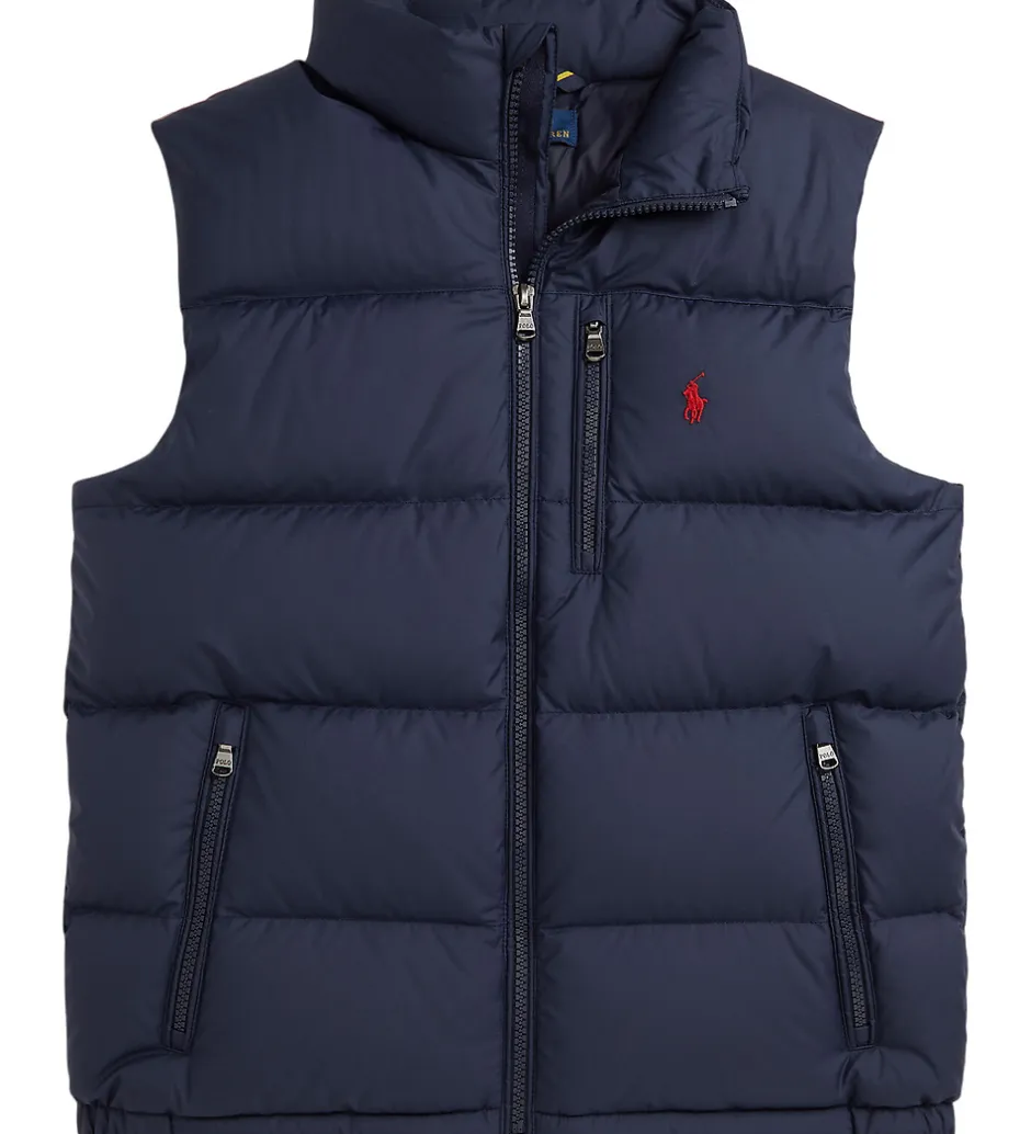 Lækker Polo Ralph Lauren dunvest i ensfarvet navy med et lille, rødt logo broderet fortil.