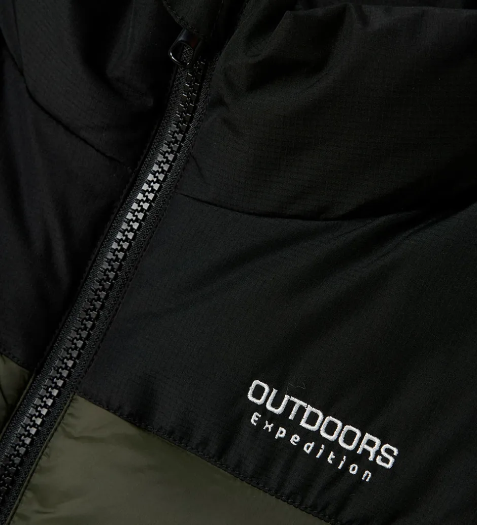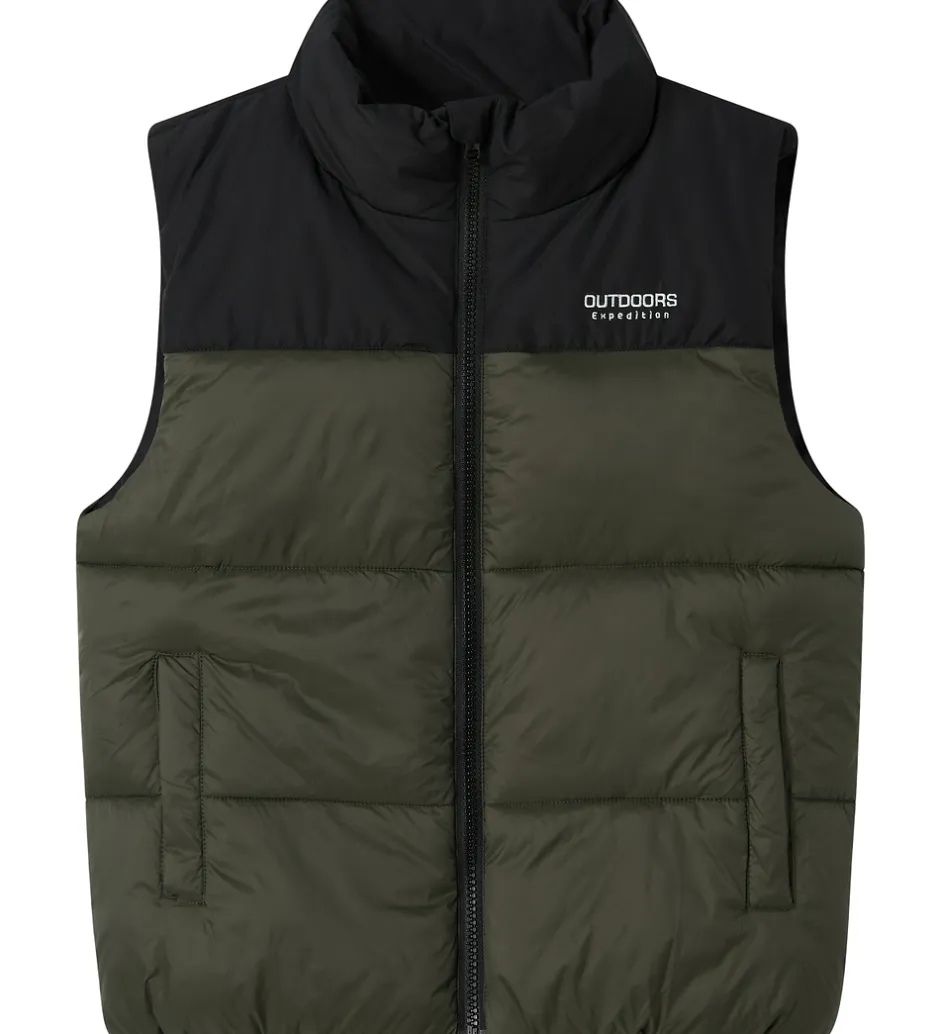 Lækker Name It dynevest i en flot kombination af sort og olivengrøn med et hvidt “OUTDOORS expedition” logo på brystet.
