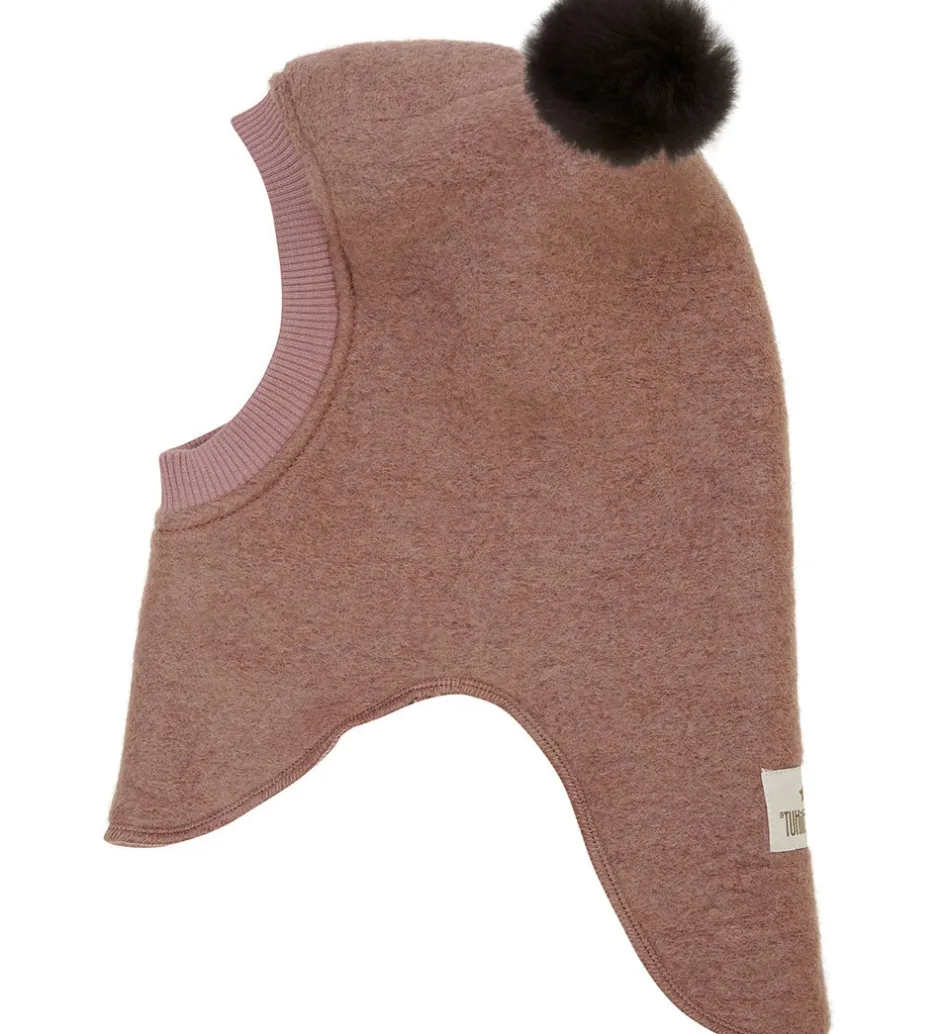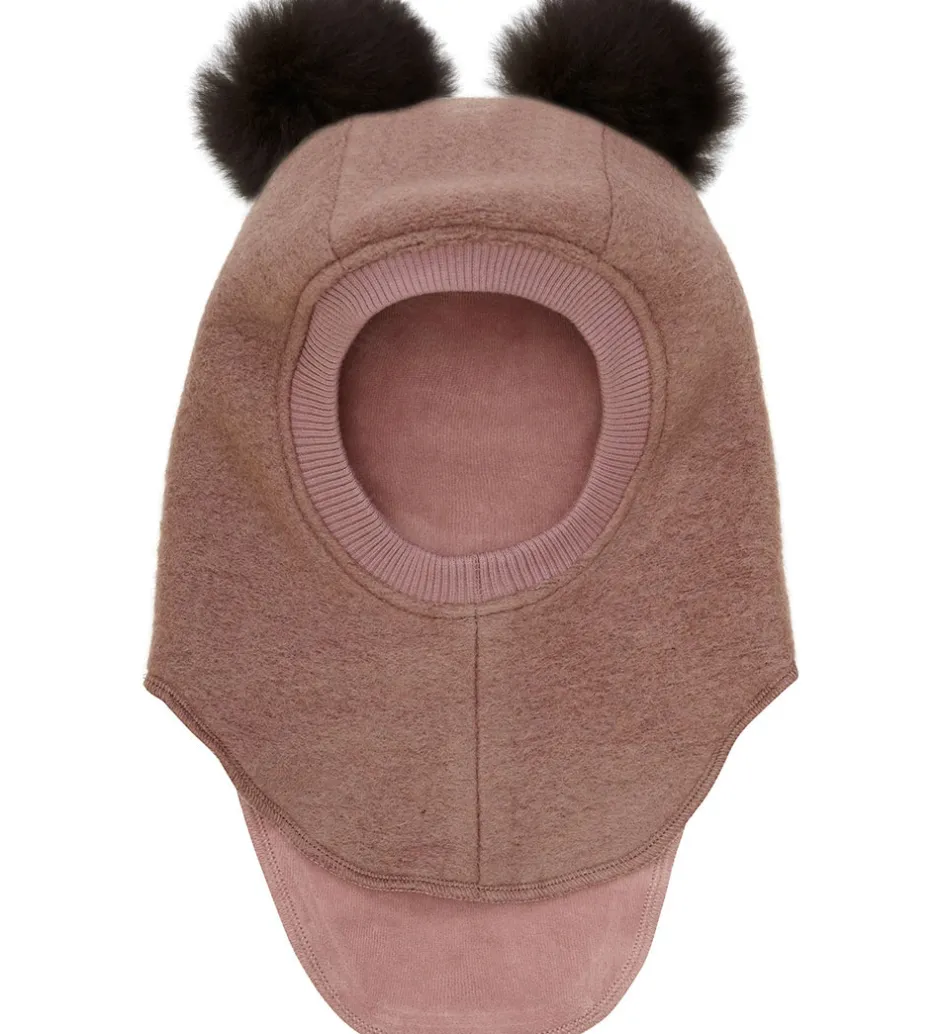 Elegant elefanthue fra Huttelihut i en mørkerosa nuance med en rund hovedform og to kvaste af alpakkapels på toppen. Elefanthuen er designet med to lag for ekstra isolering og har en ribkant i åbningen, der sikrer en god pasform.