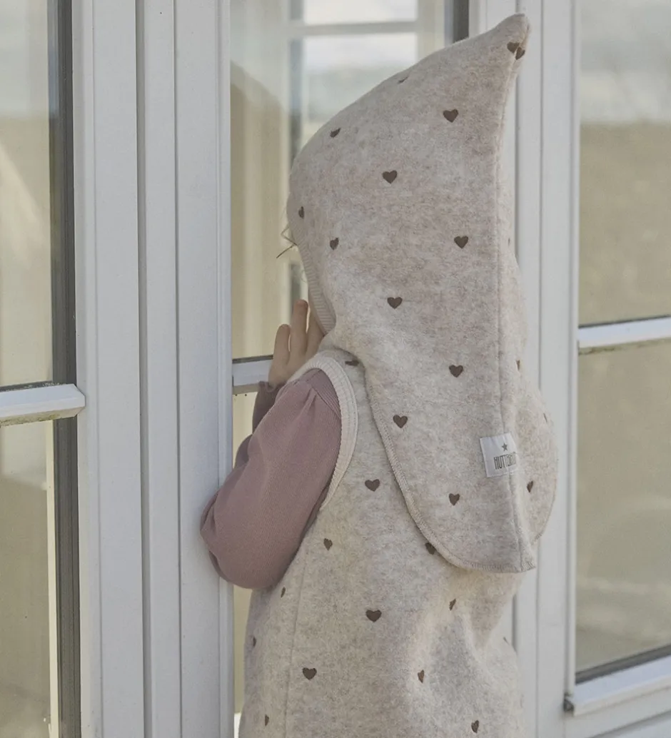 Charmerende Huttelihut elefanthue af lunt uldfleece i en meleret beige med små, brune hjerter. Huttelihut elefanthuen har en spids hovedform og består af to lag. Den har en rund åbning til ansigtet og en blød ribkant, der giver en god pasform.