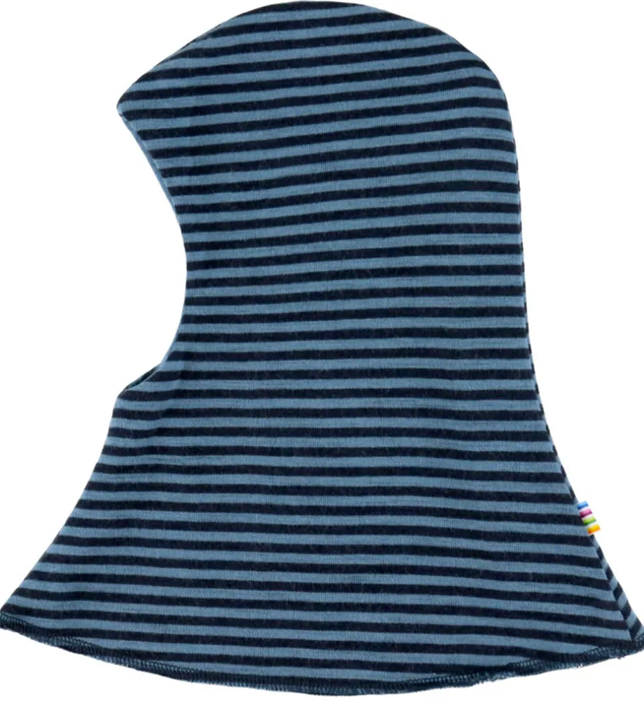 Praktisk Joha elefanthue i et blåt, stribet mønster. Johas elefanthue består af to lag og har en rund hovedform med en split-effekt i bunden. Den tætsiddende pasform giver god beskyttelse.
