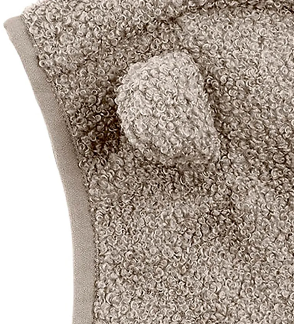 Mini A Ture elefanthuen har en rund hovedform med en smal elastik i nakken, så den sidder tæt til hovedet, og i toppen sidder der to søde ører. I ansigtsåbningen er der en smal kant, og i bunden har den et praktisk split-design. Elefanthuen består af ét lag, og på indersiden er der almindeligt, blødt fleece.