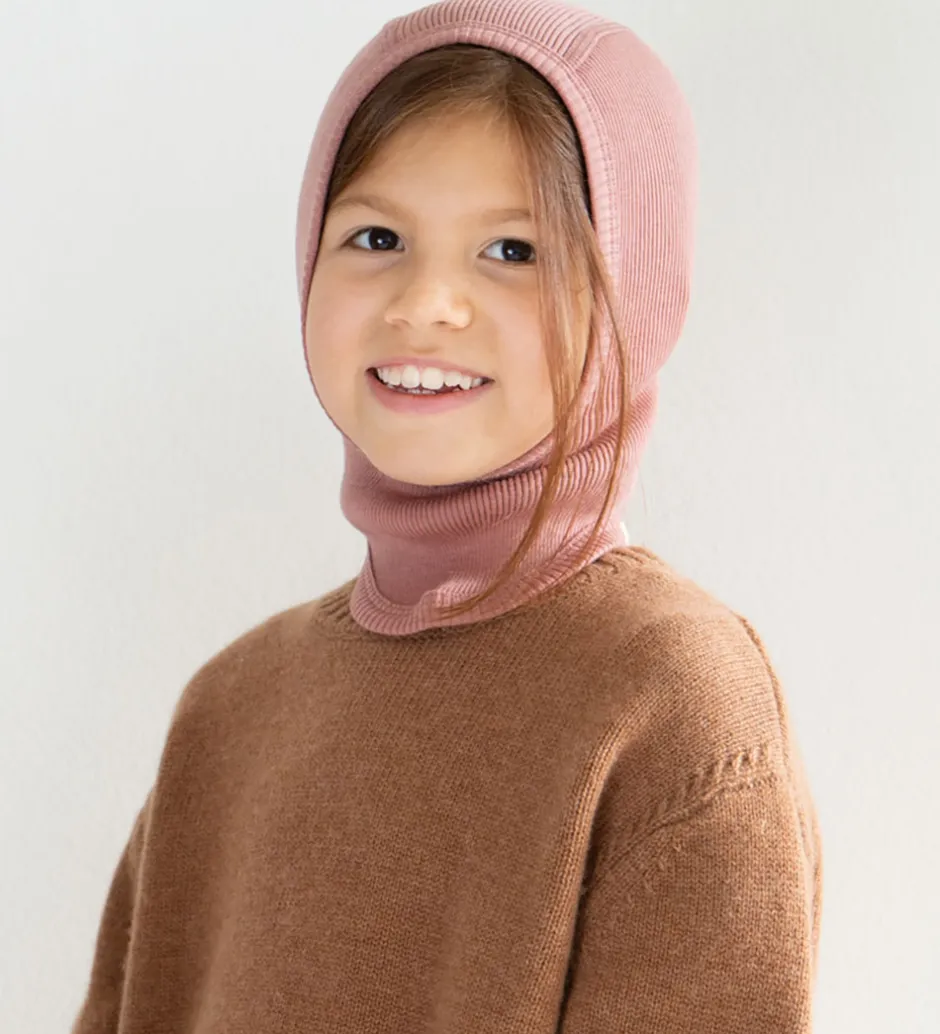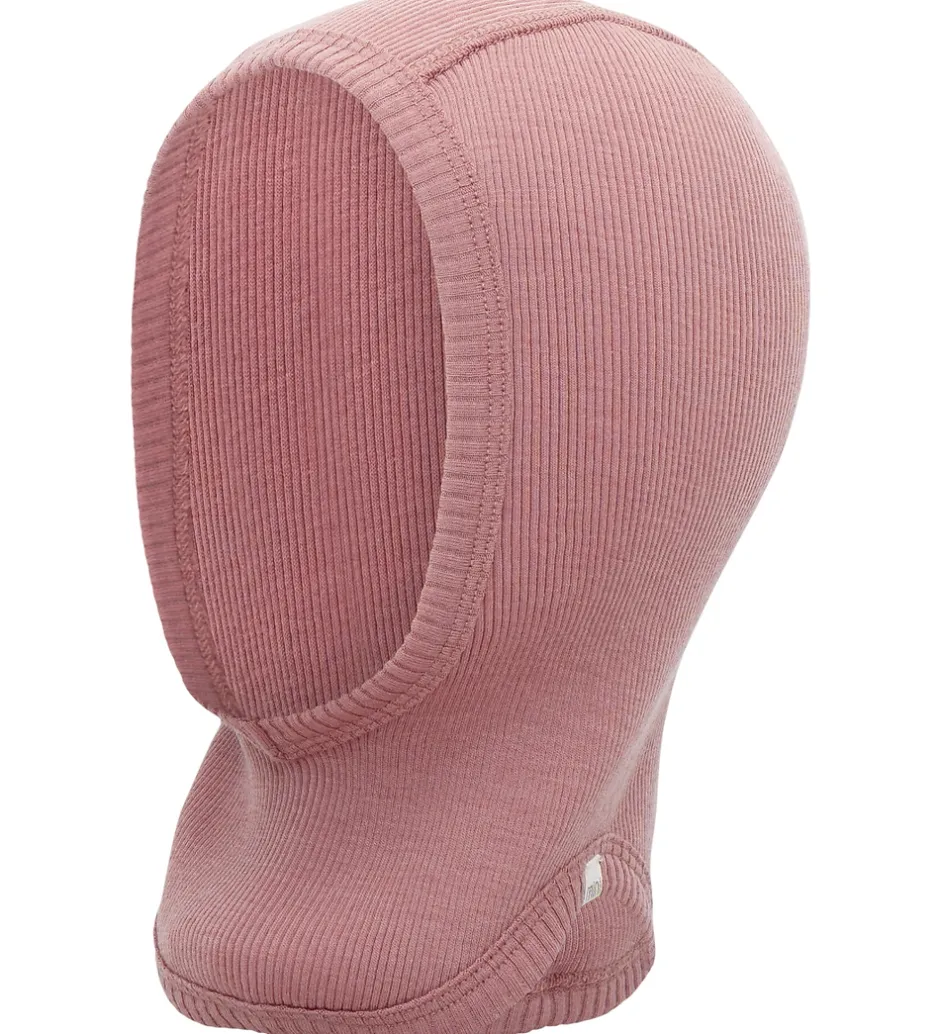 Sød Minimalisma elefanthue i rosa med ribstruktur, og den er lavet af blødt merinould. Minimalisma elefanthuen har en rund hovedform med en split-effekt i bunden, som giver et godt fit, og den består af et enkelt lag.