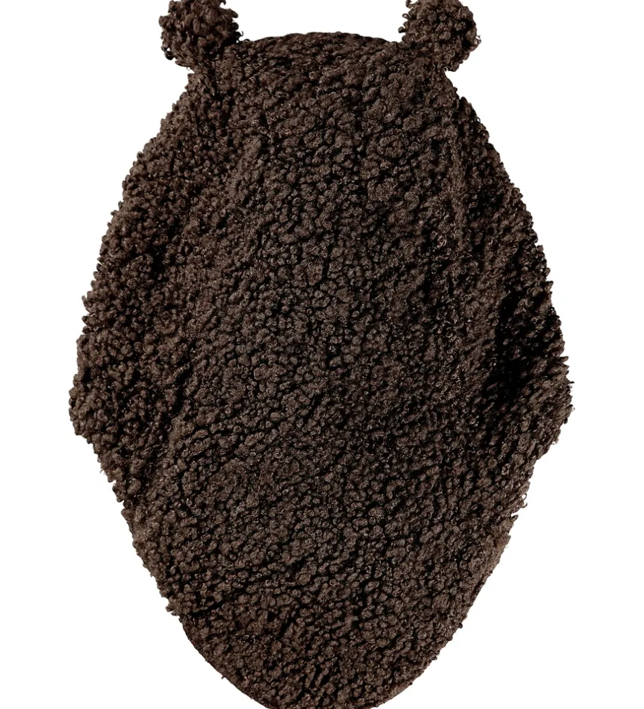 Charmerende Molo elefanthue i mørkebrunt teddyfleece. Molo elefanthuen består af to lag og har en rund hovedform med små ører på toppen. Den indvendige del har en blød, grå overflade, der giver et stilrent udtryk.