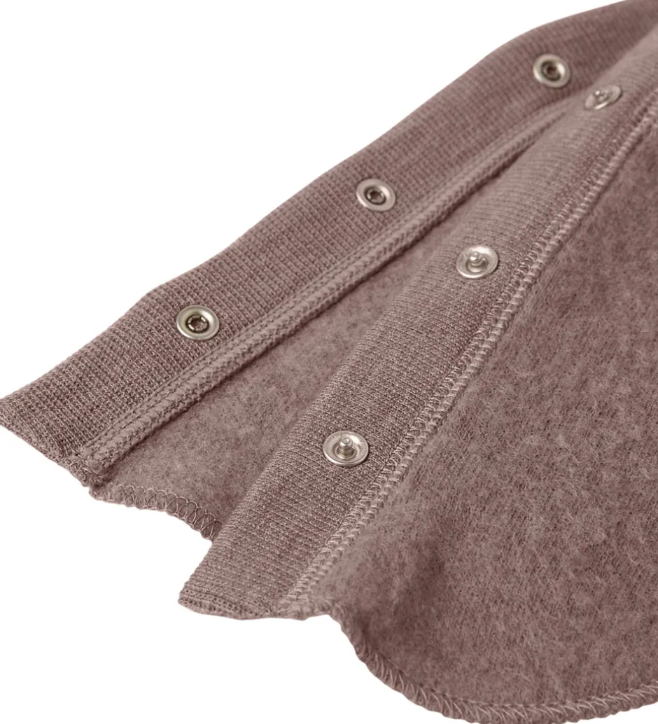 Name It elefanthuen har en rund hovedform med en bred ribkant i ansigtsåbningen. Under hagen er der gennemgående trykknapper, så elefanthuen er nem at få af og på. Elefanthuen består af ét lag lækkert fleece i merinould.