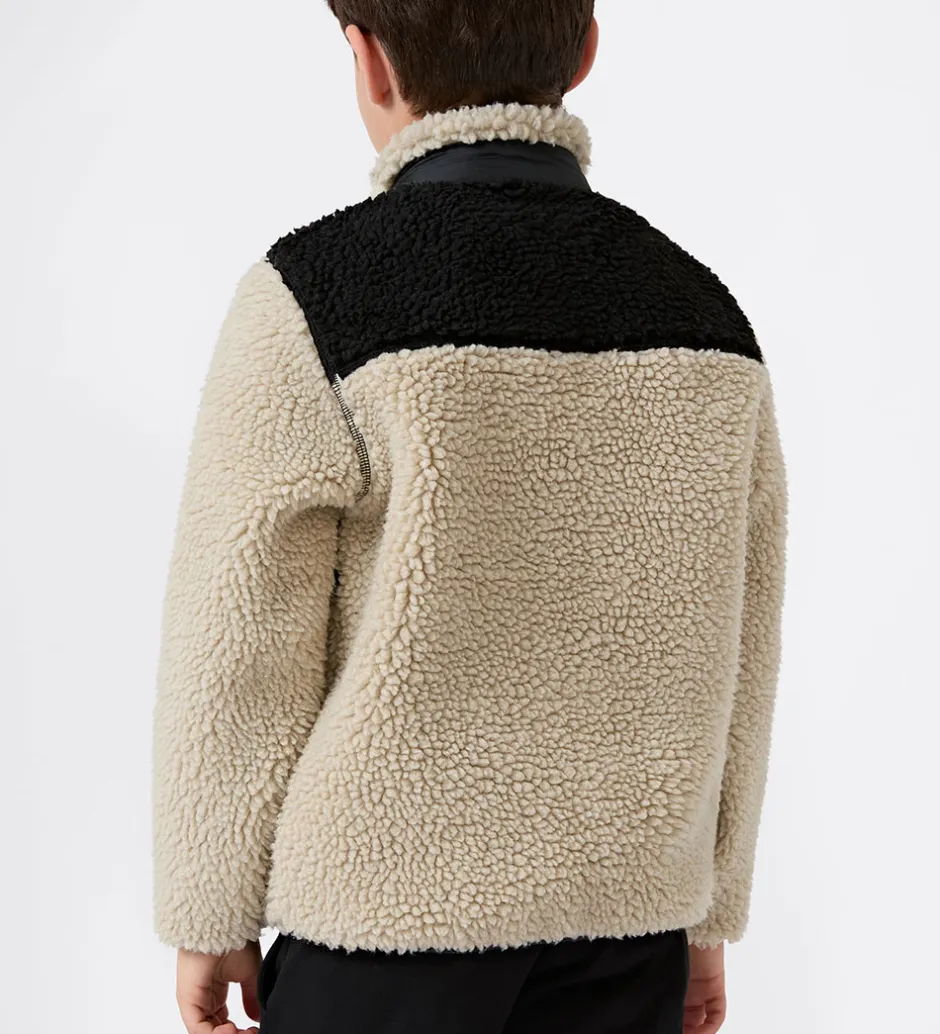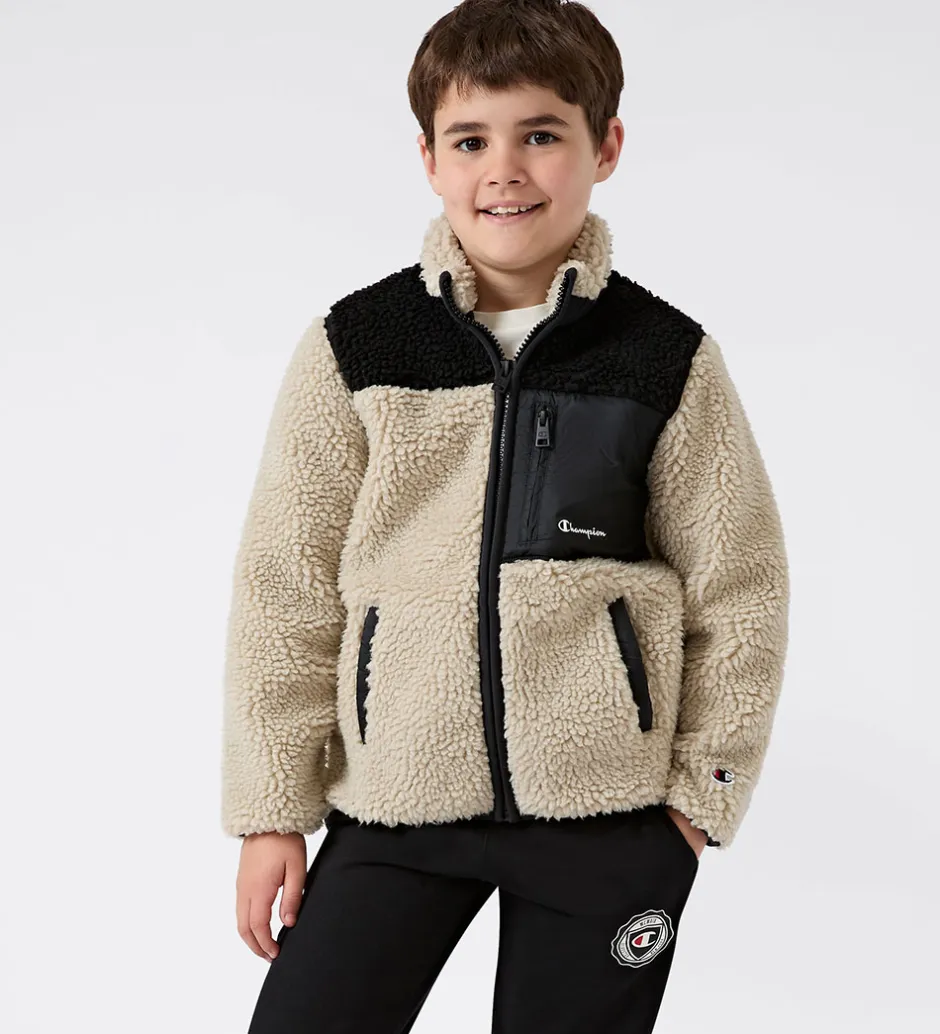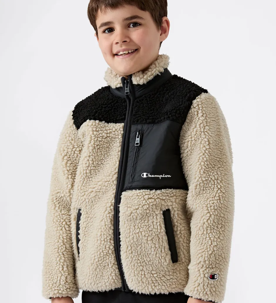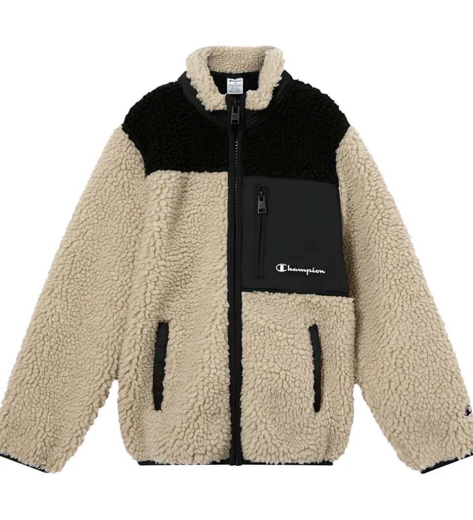 Flot Champion fleecejakke i beigefarvet teddyfleece med sorte detaljer.