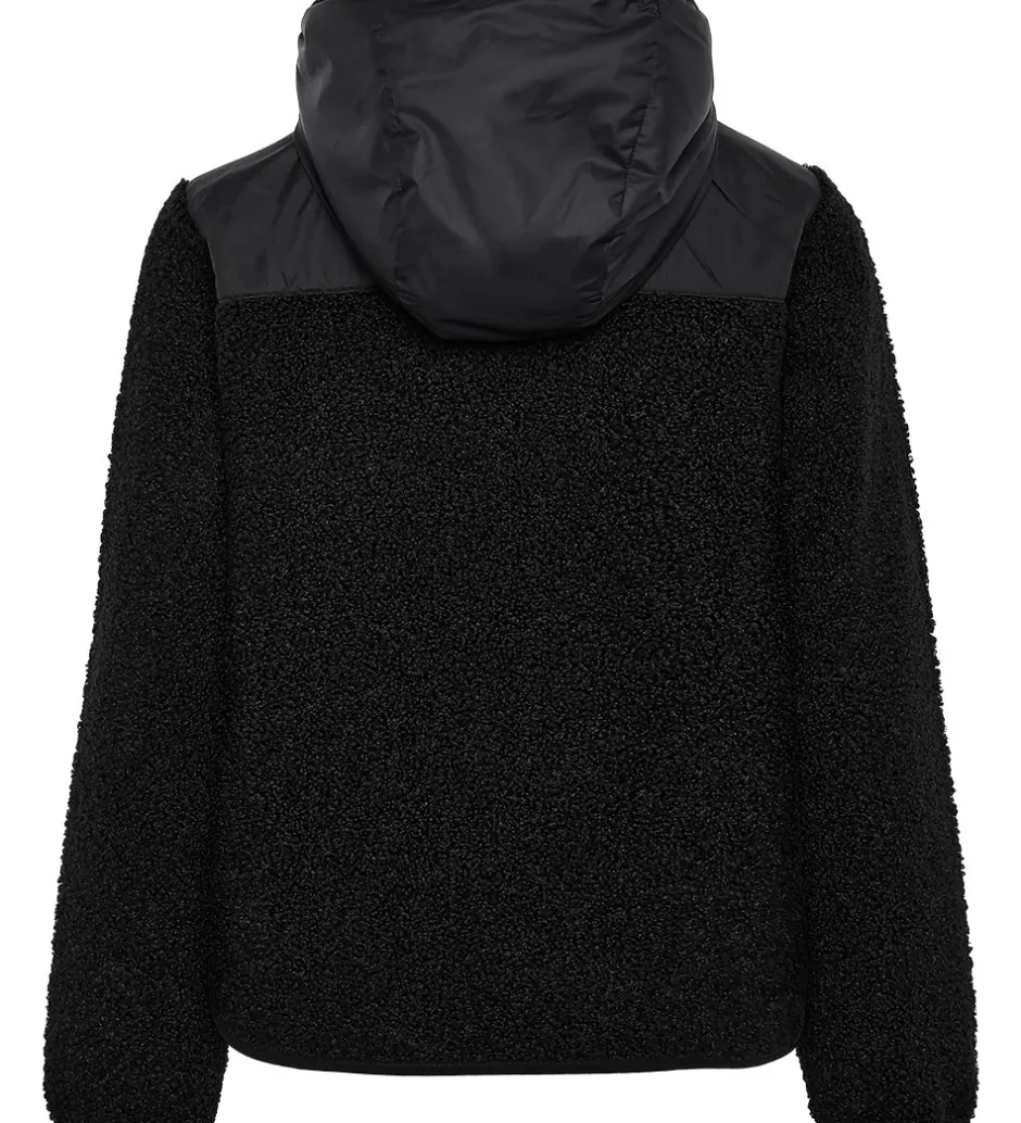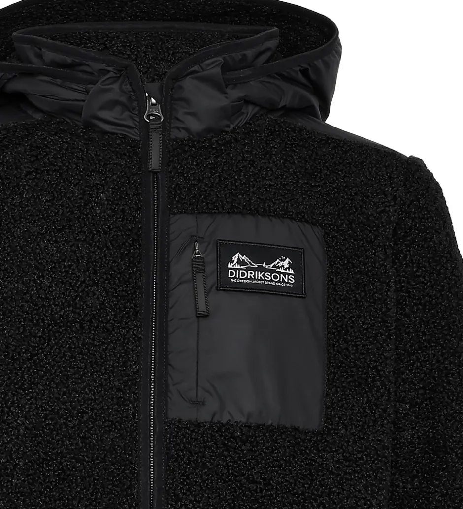LÆkker Didriksons fleecejakke i ensfarvet sort teddyfleece. Fleecejakken har en aftagelig hætte, som sidder fast med skjulte trykknapper, og den er lavet i en glatvævet kvalitet. Fleecejakken har smalle, elastiske kanter, og den åbnes med en skjult lynlås med hagebeskytter og indvendig vindstolpe. Ærmerne har et praktisk hul til tommelfingeren, og i venstre side sidder der en brystlomme, som lukkes med en lynlås.