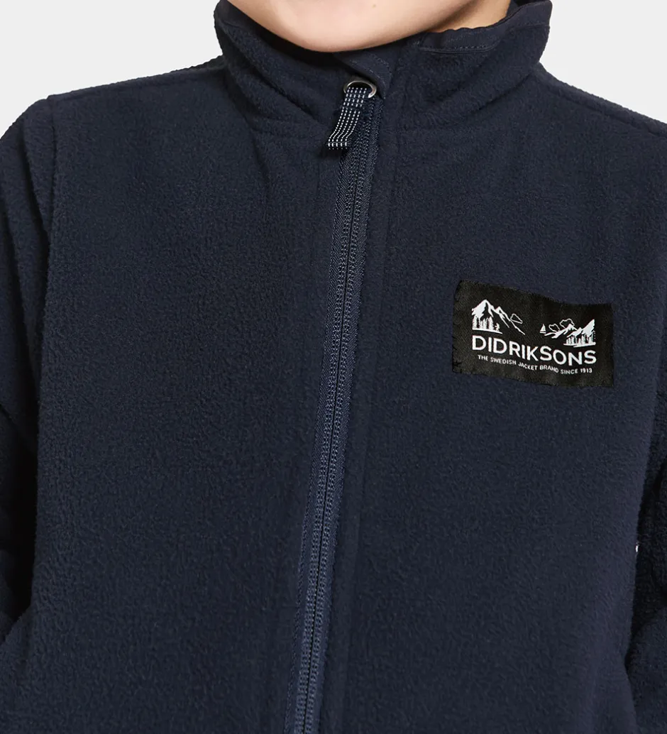Dejlig Didriksons fleecejakke i navyblå fleece med en sort og hvid logo-patch på venstre bryst.