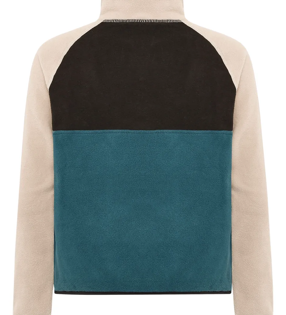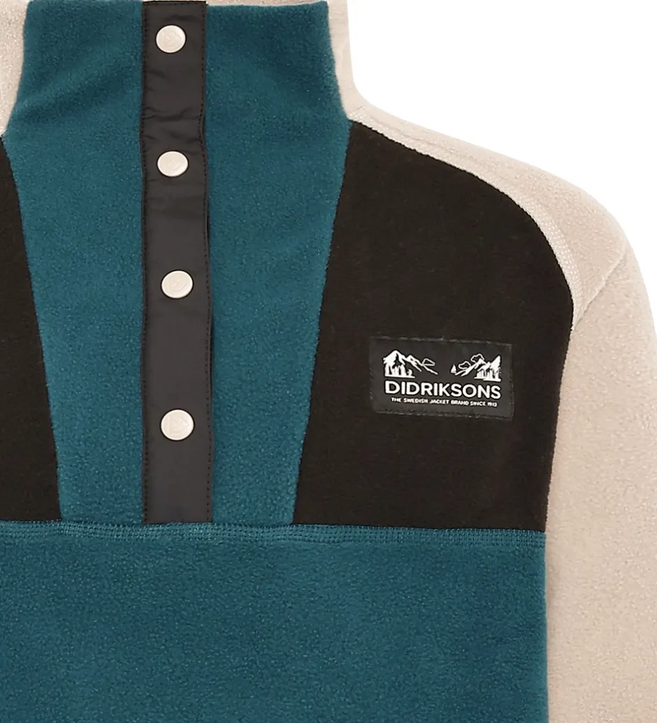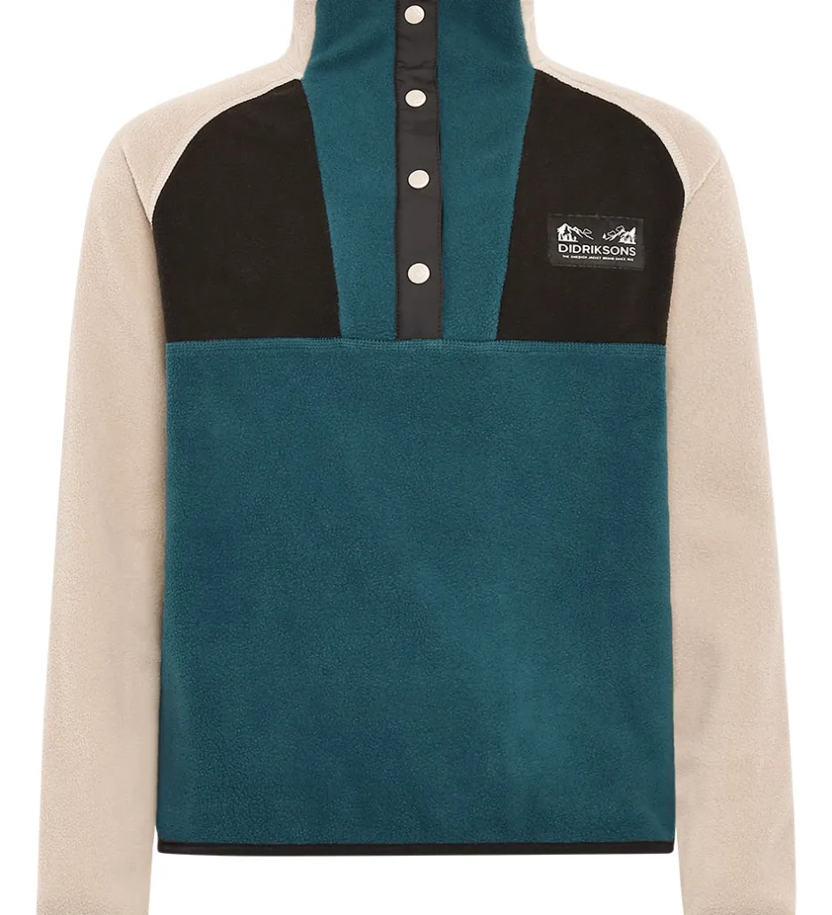 Skøn Didriksons fleecetrøje med en kombination af petroleumsblå, sort og beige. Fleecetrøjen har smalle, elastiske kanter og en høj hals. Fleecetrøjen åbnes i toppen med trykknapper.