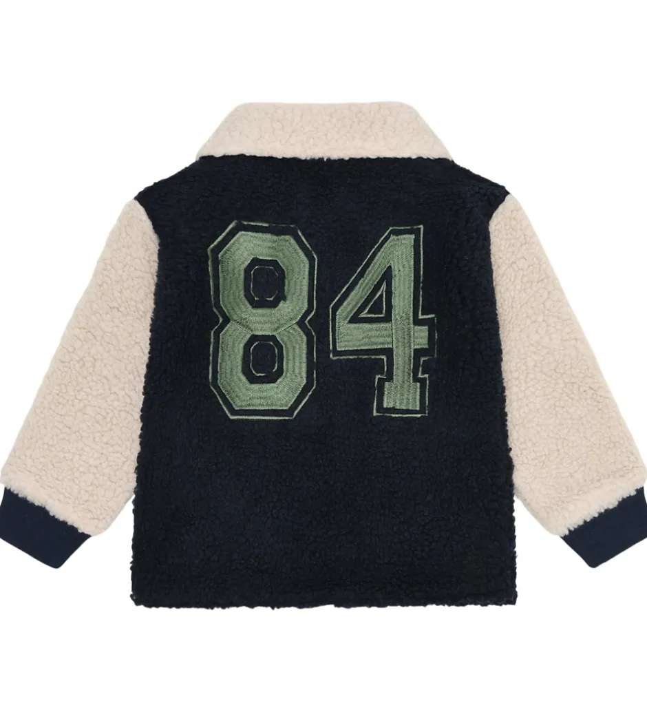 Stilfuld Hust and Claire fleecejakke med et elegant design i navyblå og cremefarvet teddyfleece. Fleecejakken har et kontrastmønster, der kombinerer de to farver på smart vis.