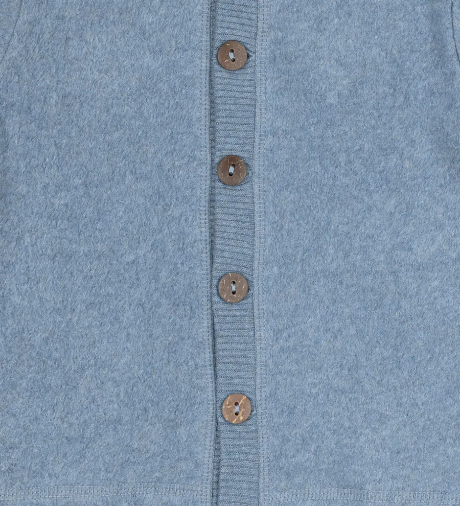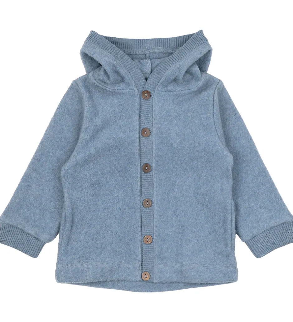 Lækker Mikk-Line fleecetrøje i en skøn blå farve med gennemgående brune knapper fortil. Fleecetrøjen har en blød, spids hætte og lange ærmer. Den har ribkanter i åbningen fortil samt i ærmerne. Fleecetrøjen har en lomme i hver side og er fremstillet i en meget blød og lun kvalitet.
